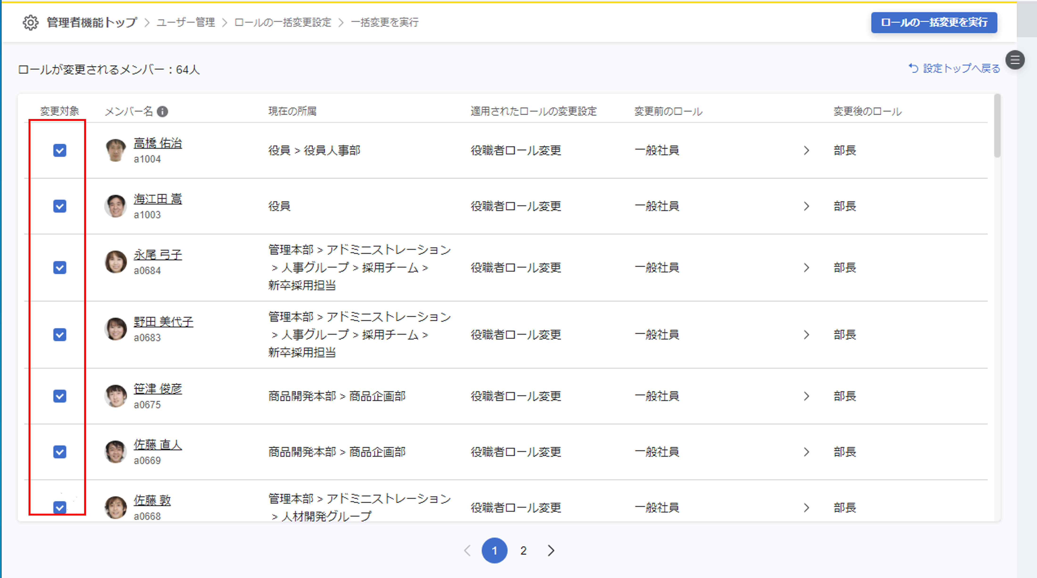 変更実行画面でロールを変更する対象メンバーを事前に確認できますが、チェックを外して変更対象から除くことができるようになりました。