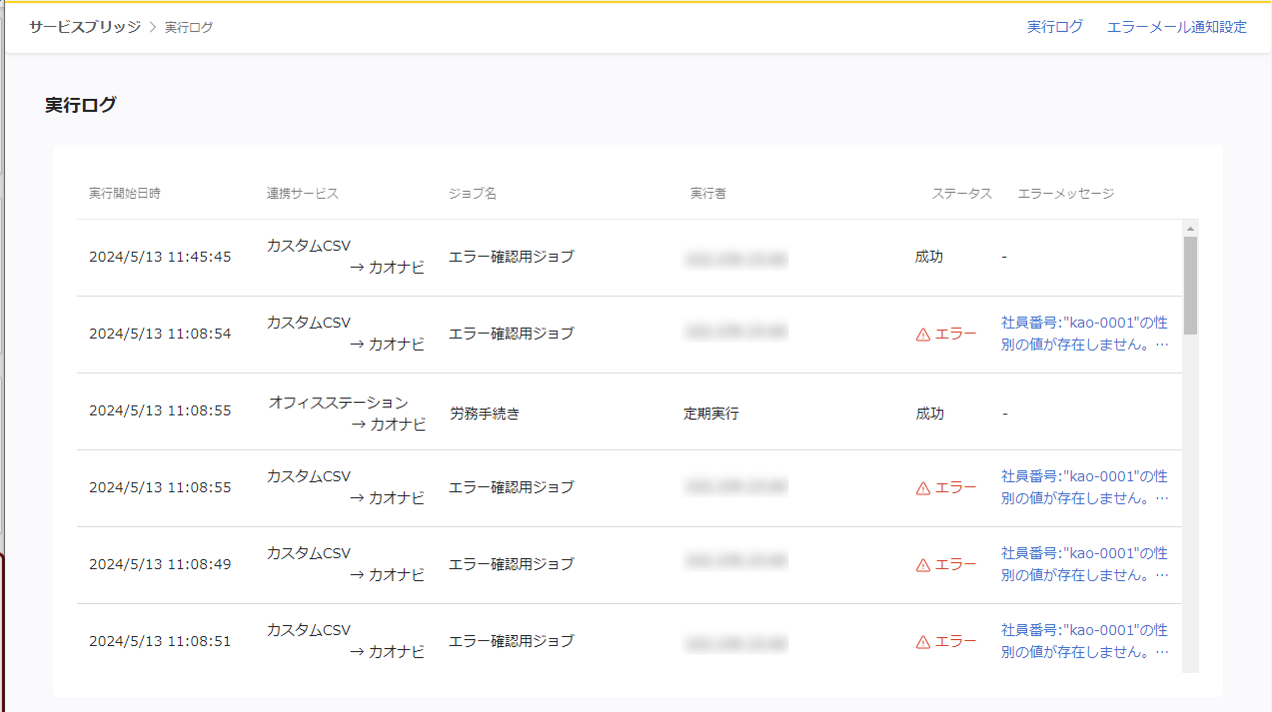 ・管理者機能>システム連携>サービスブリッジの共通操作>実行ログを確認する
