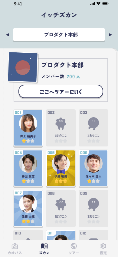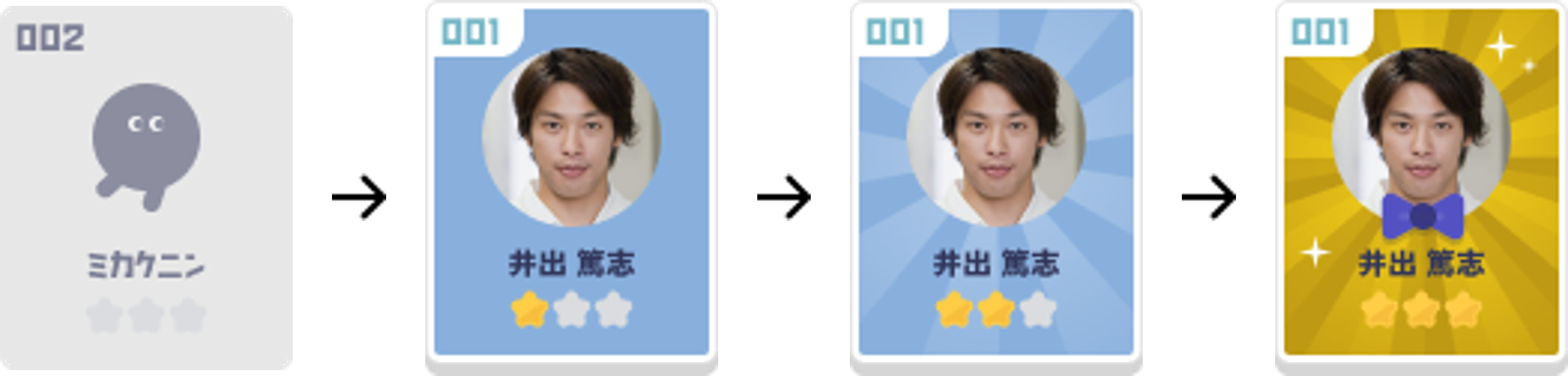 カオを当てた(イッチした)回数に応じ、以下のようにメンバーの顔写真の背景デザインが変わります。