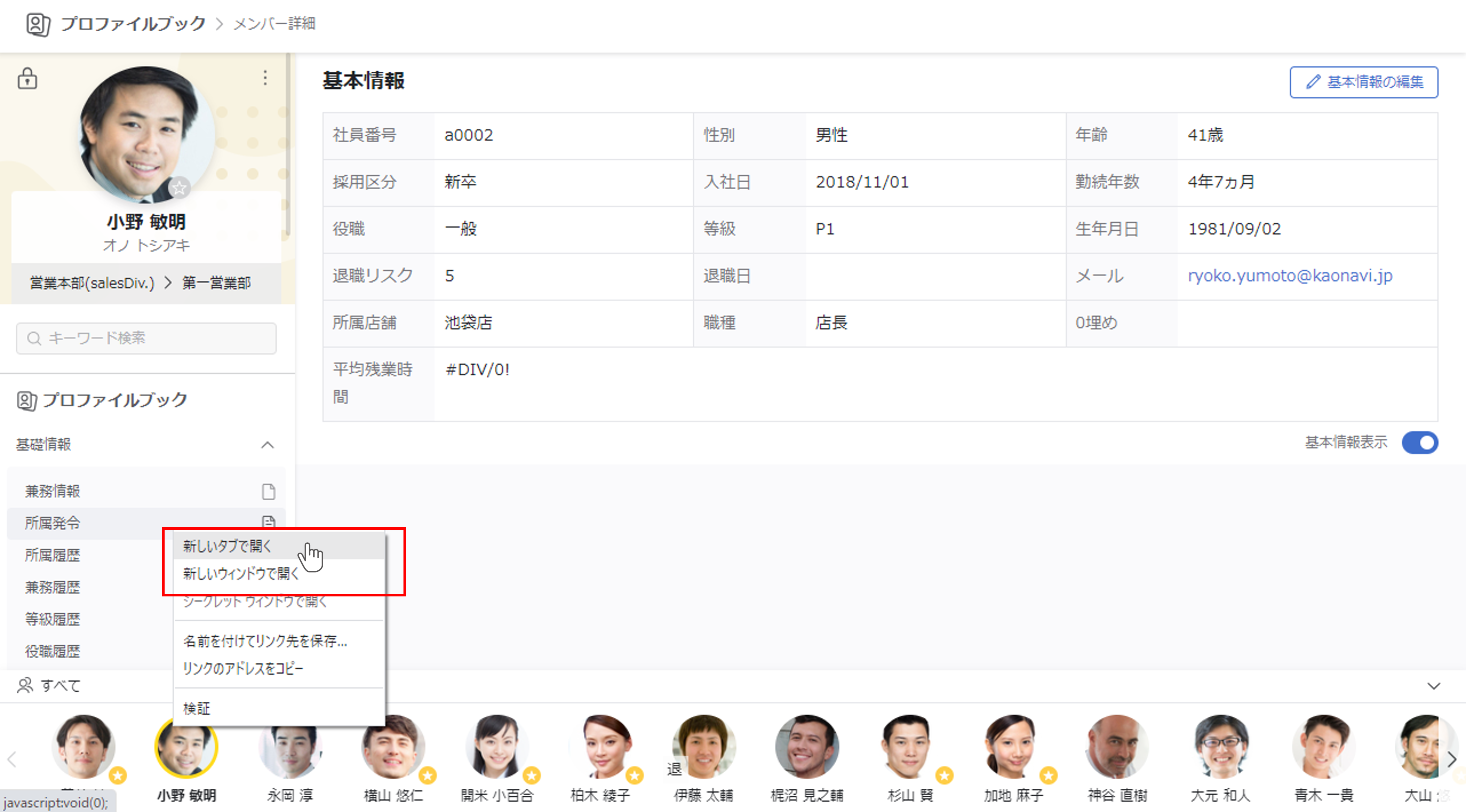 この対応により、プロファイルブックのシート、マイボード、機能リンク全てで、右クリックから「新しいタブで開く」「新しいウィンドウで開く」ことができるようになりました。