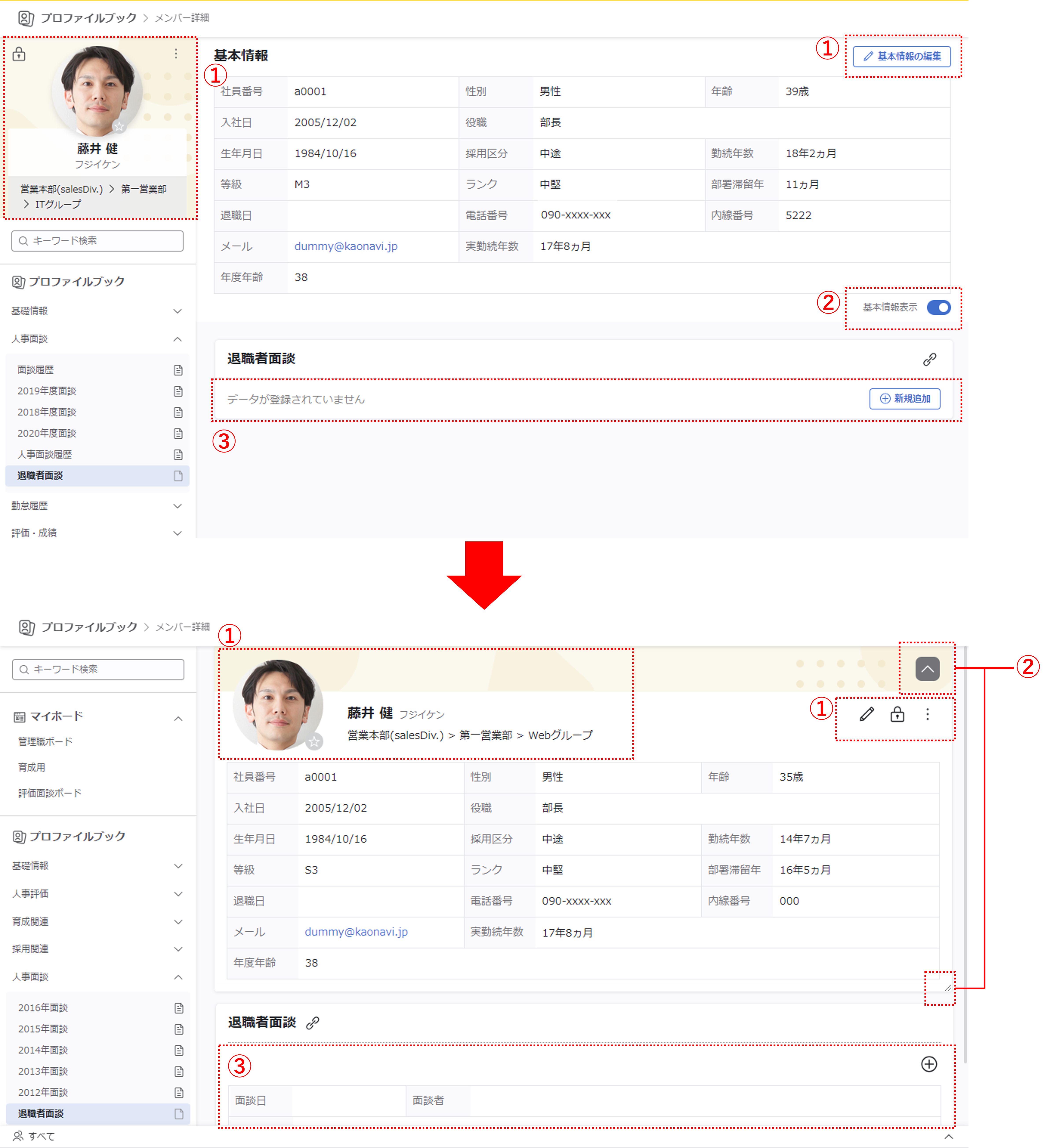 | ① | 左カラムにあった顔写真と各種設定メニューを、右側の基本情報エリアに移動しました |