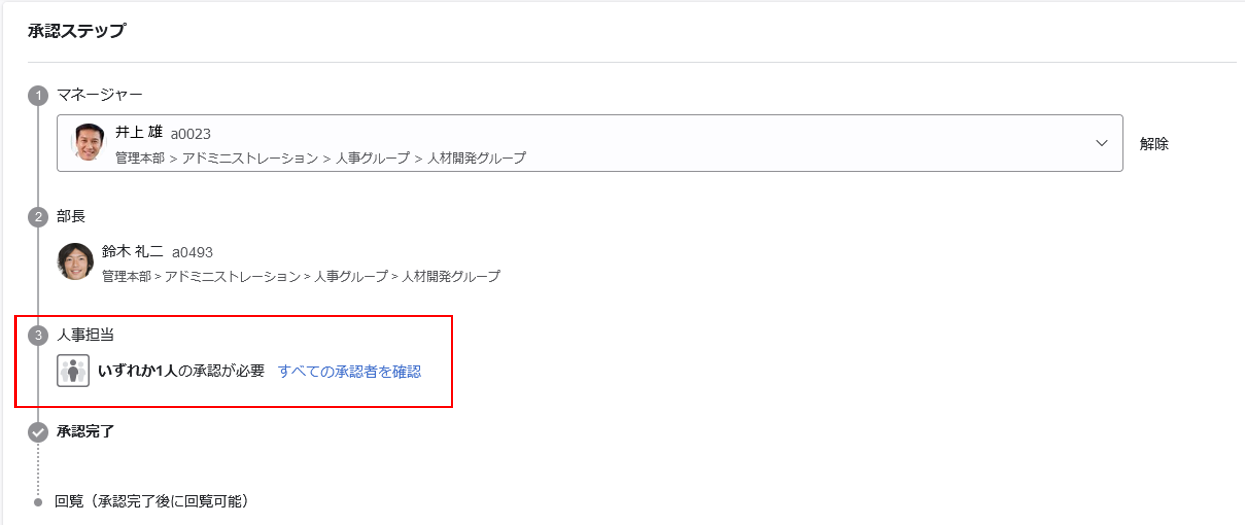 また、グループ内の全員の承認が必要か、グループ内いずれか1人の承認が必要かも選択できます。