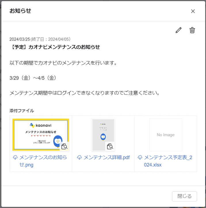 カオナビで表示されるお知らせの添付ファイルが、画像・PDFの場合にサムネイル(縮小)表示されるようになりました。