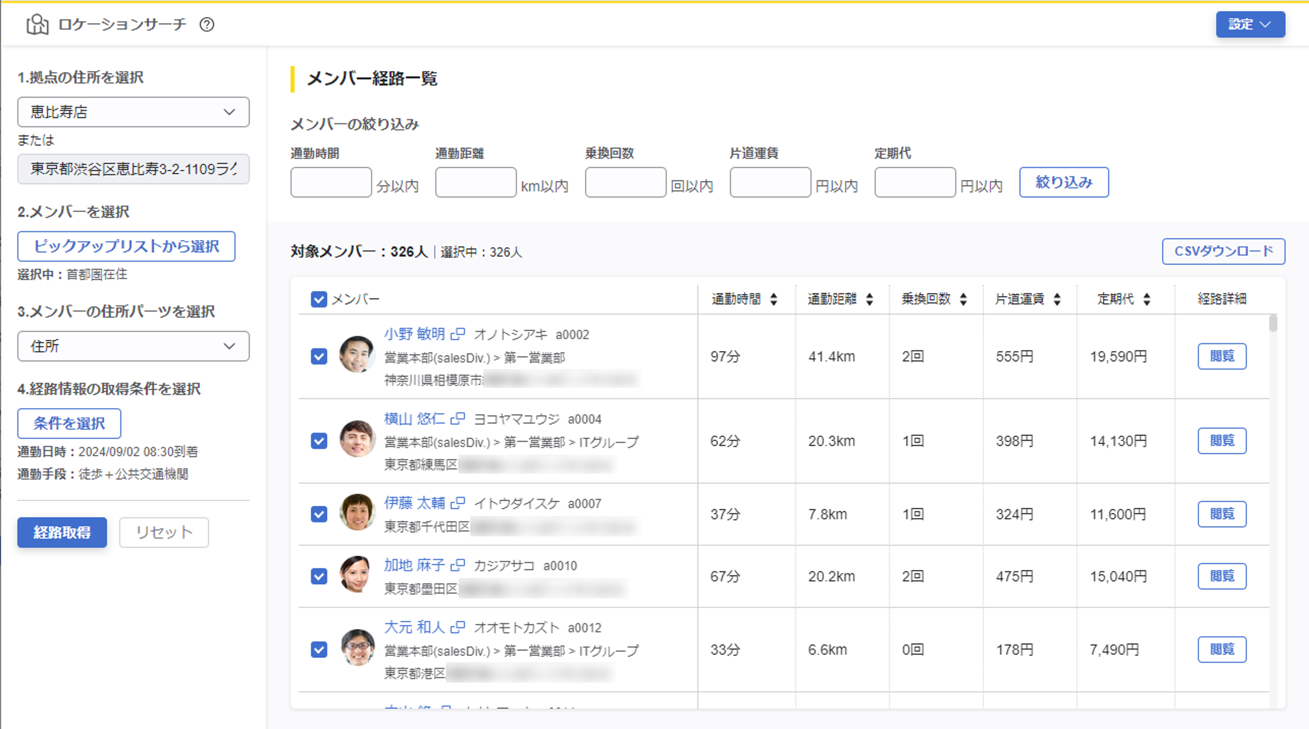 異動候補者や研修対象者など、最大100名の通勤時間や交通費をまとめて検索できます。