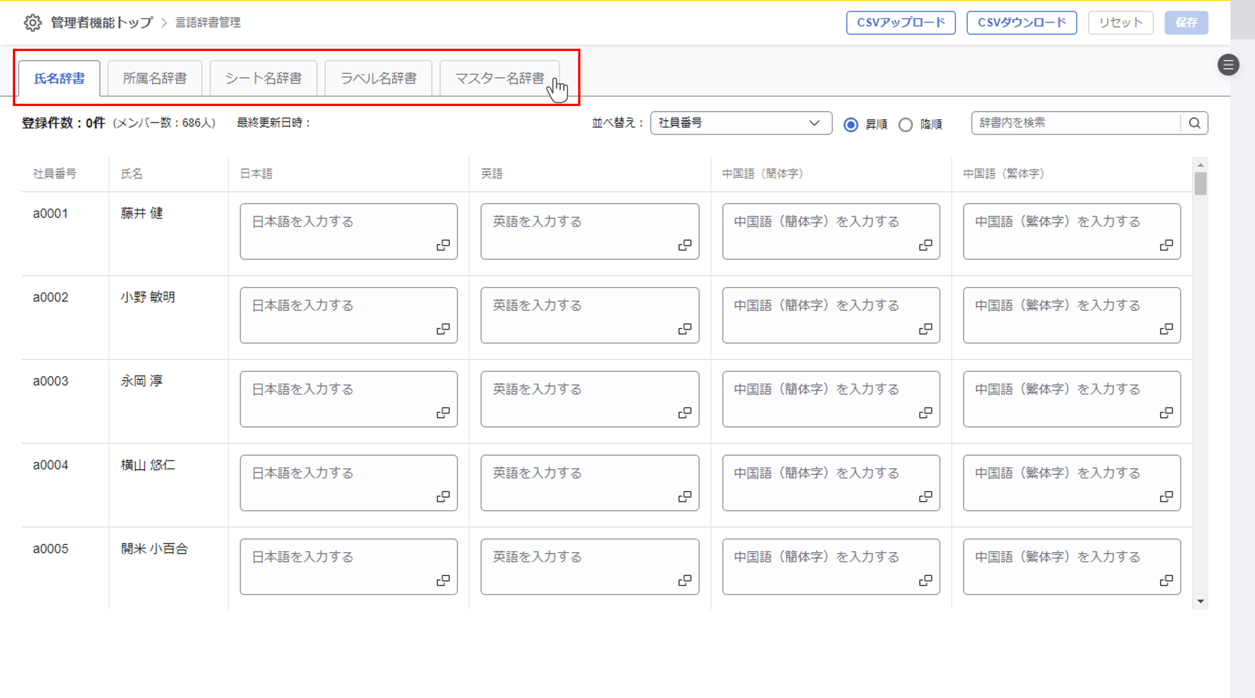 表示言語の切り替えで、氏名・所属名を各言語で表示できる「言語辞書管理」機能をリリースしておりますが、氏名・所属名のほかに、新たにプロファイルブックの「シート名」「ラベル名」「マスター名」を登録できるようになりました。