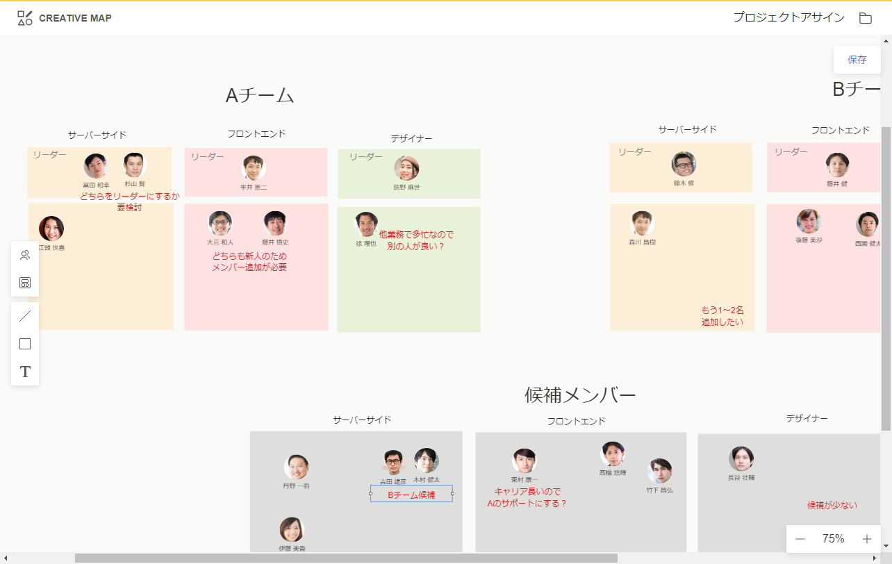 新チームのメンバーや候補のメンバーもキャンパス上にまとめてマッピングし、アサイン検討を行えます。