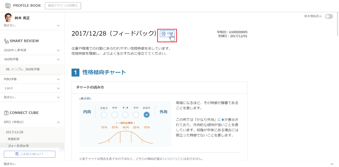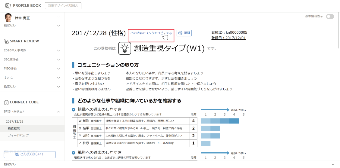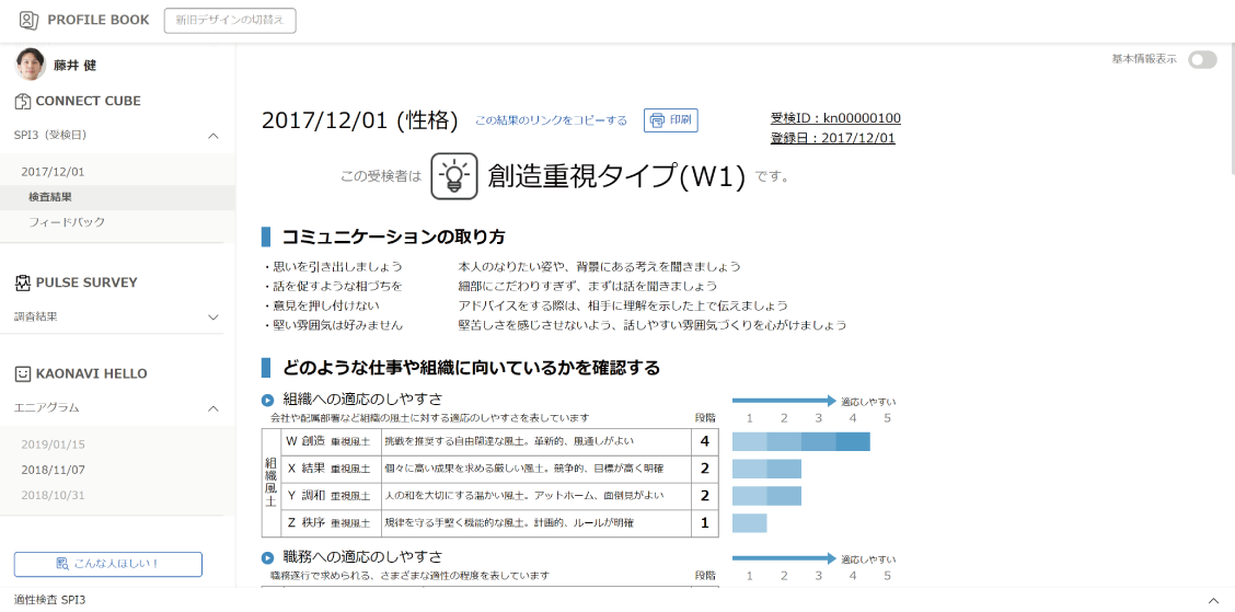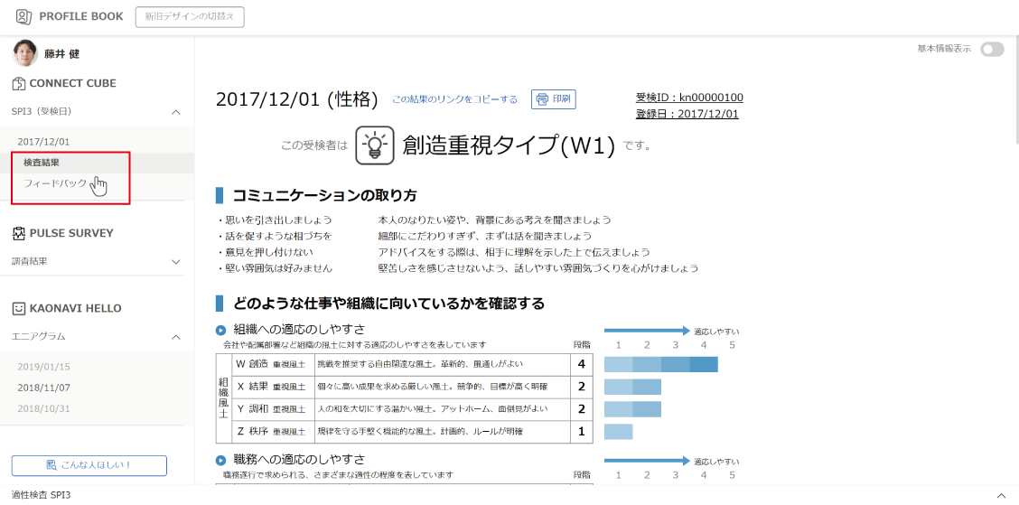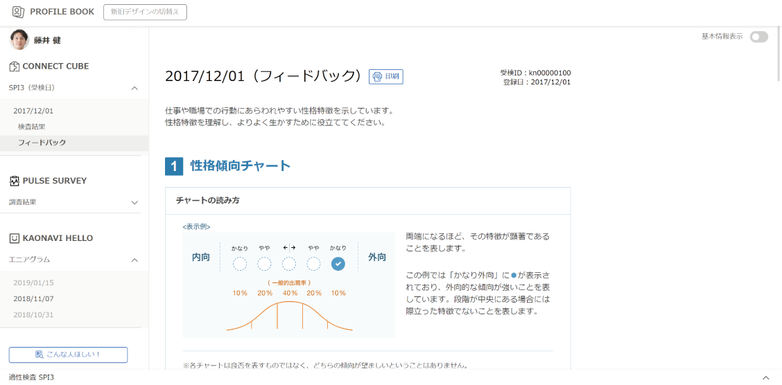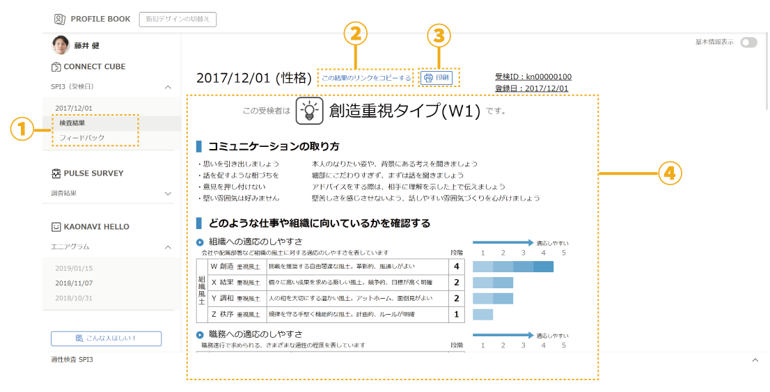 個人の結果はプロファイルブックで閲覧できます。