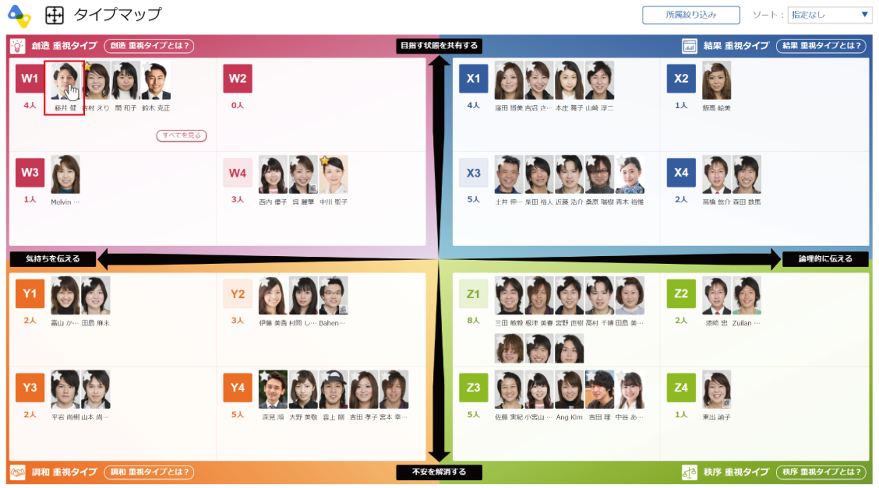 受検結果一覧、またはタイプマップから結果を見たいメンバーの顔写真をクリックします。