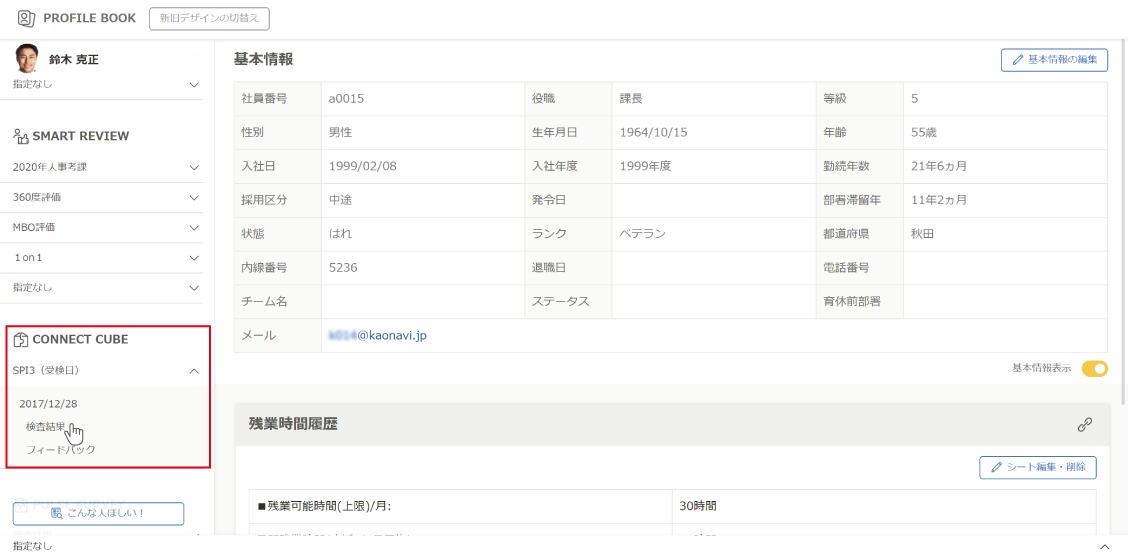 プロファイルブックで受検結果を閲覧したいメンバーの顔写真をクリックし、シート一覧下部の『コネクトキューブ』からも個人結果を開くことができます。