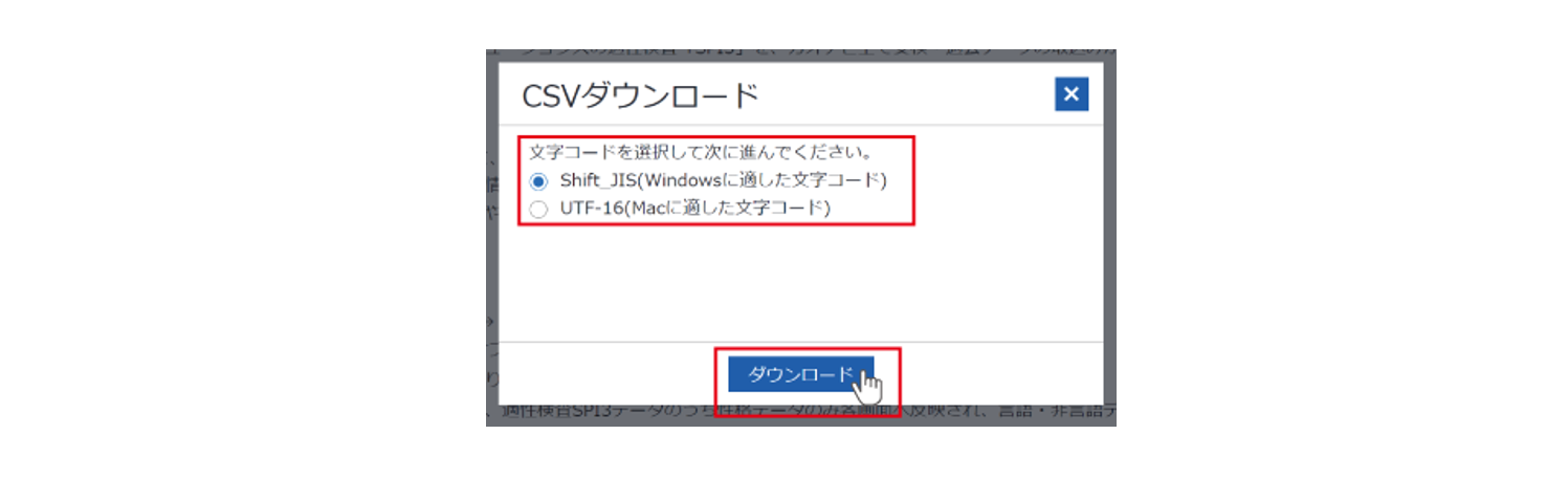 文字コードを選択し『ダウンロード』をクリックすると、受験データがCSVファイルでダウンロードされます。
