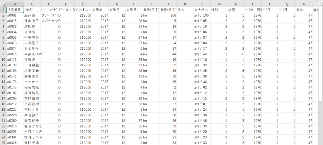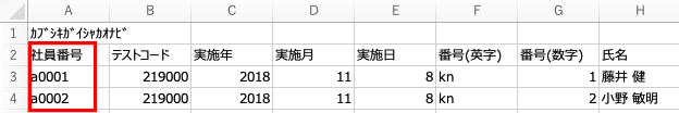 | A列の値 | 受験者のSPI3受験ID | 受検対象者のカオナビの社員番号 |