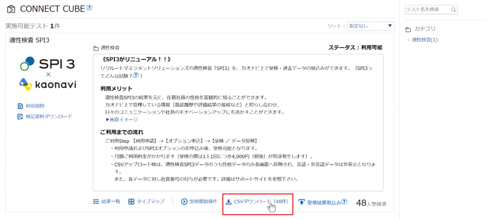 SPI3受検データの取得はサービス料金には含まれませんが、第三者であるカオナビはSPI3受検データの取得ができません。