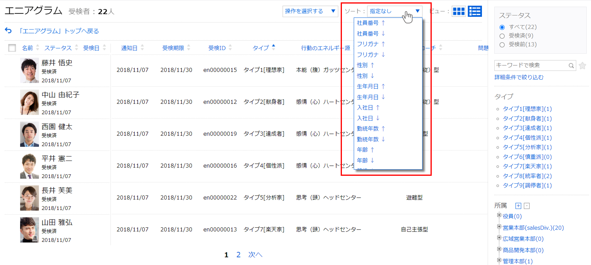 画面右上の『ソート』のプルダウンを切り替えることで、受検者を並べ替えられます。