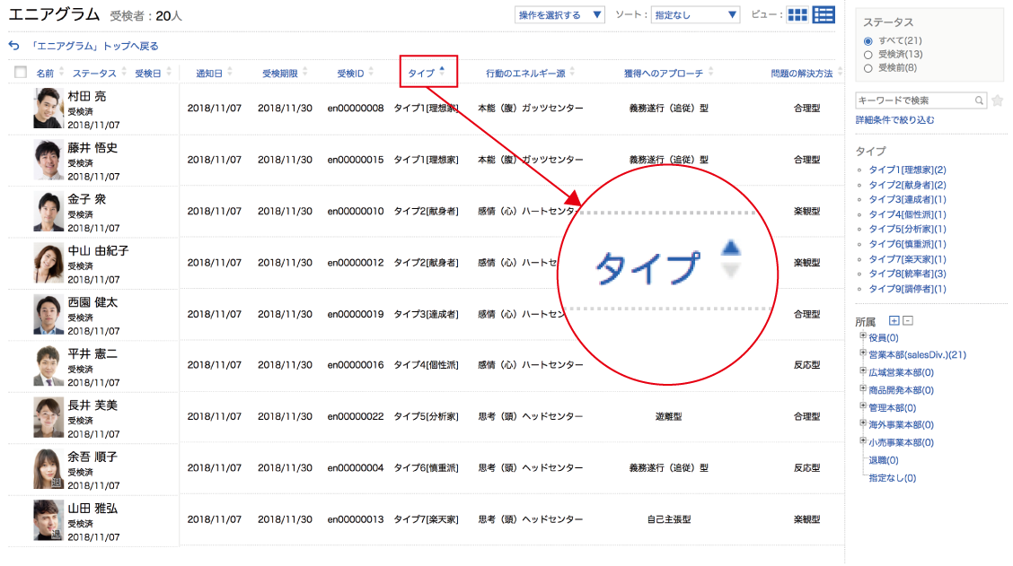ラインビューで表示されるエニアグラムの診断項目をクリックすることでもソート可能です。