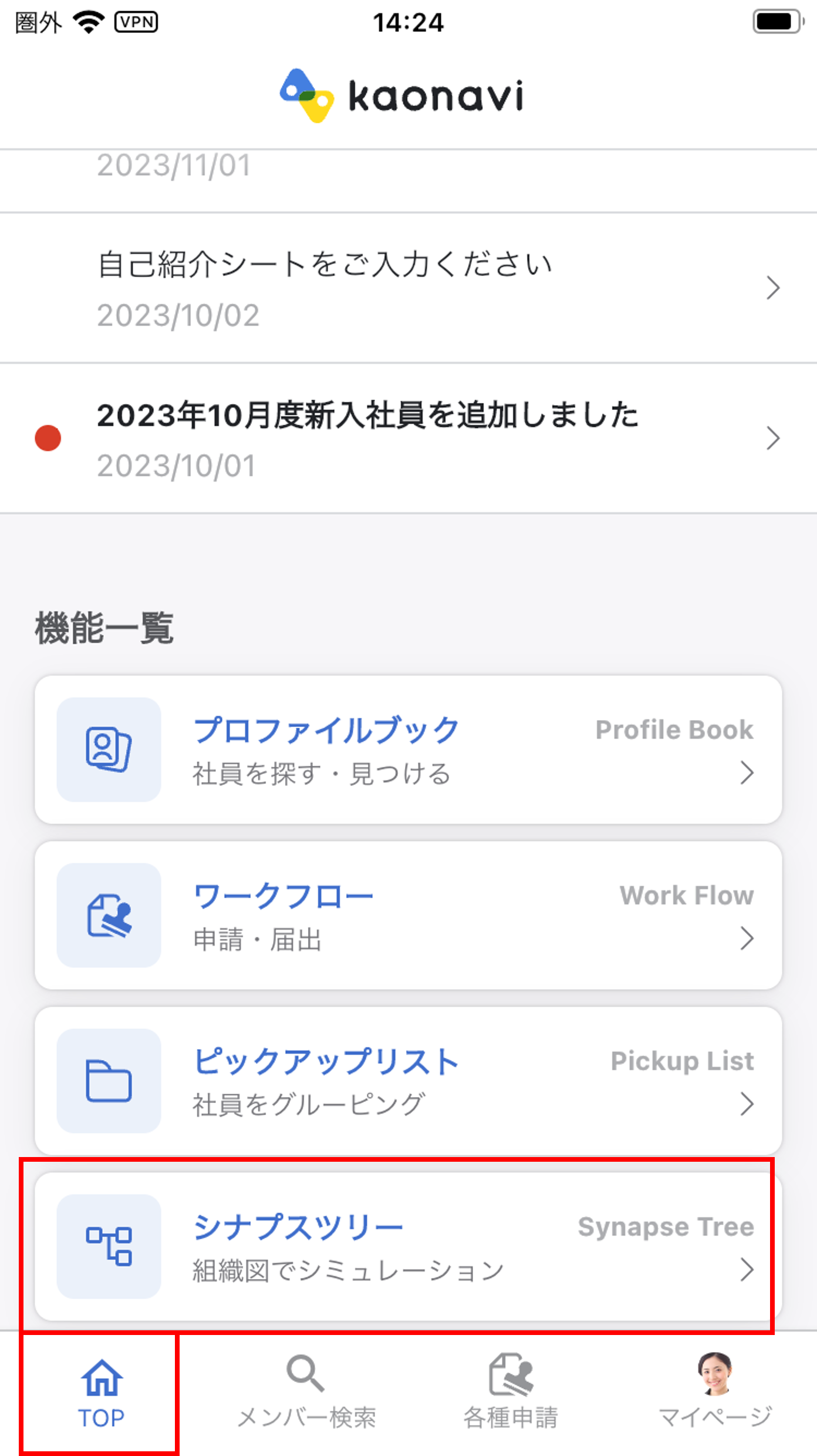 『TOP』の機能一覧から『シナプスツリー』をタップします。