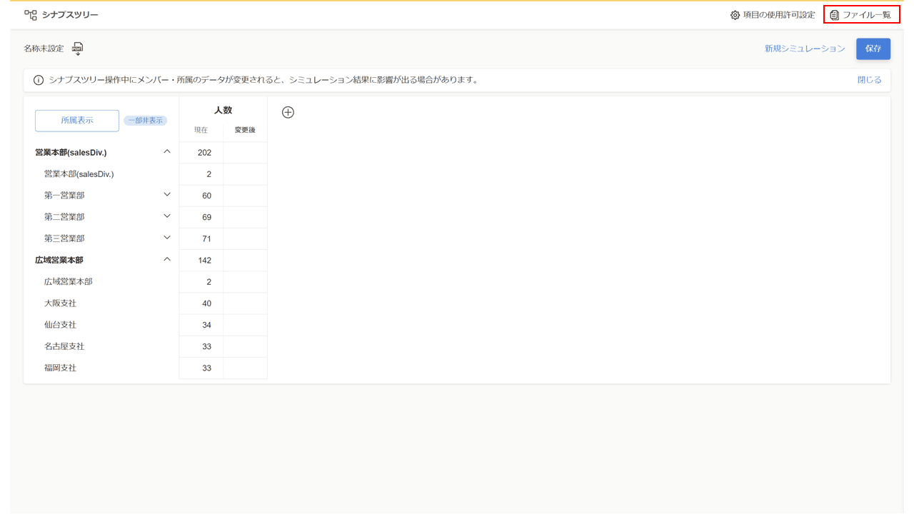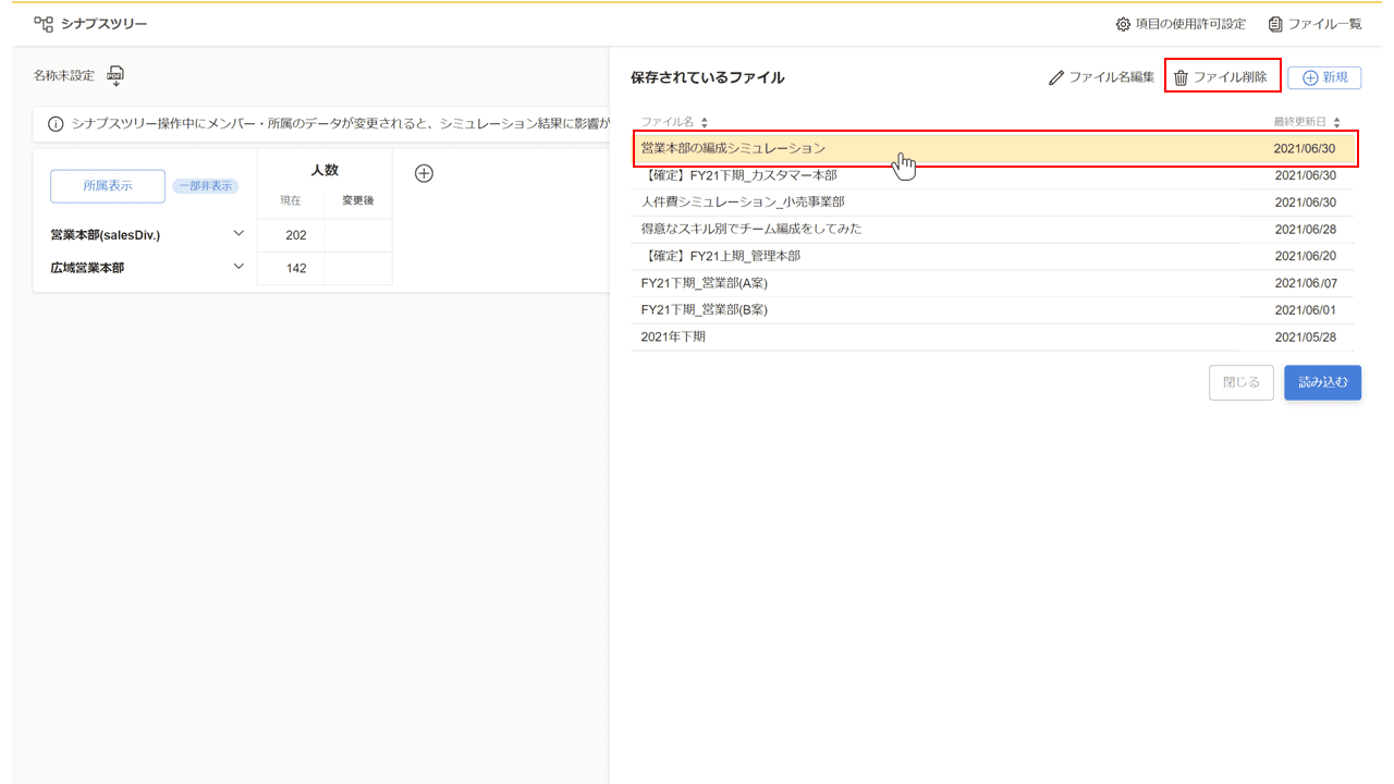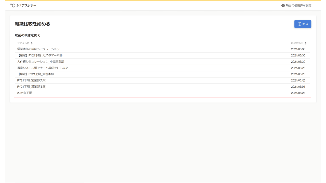 シナプスツリーのトップ画面右上の『組織比較』ボタンをクリック後、ファイル名の一覧から表示したいファイル名をクリックします。