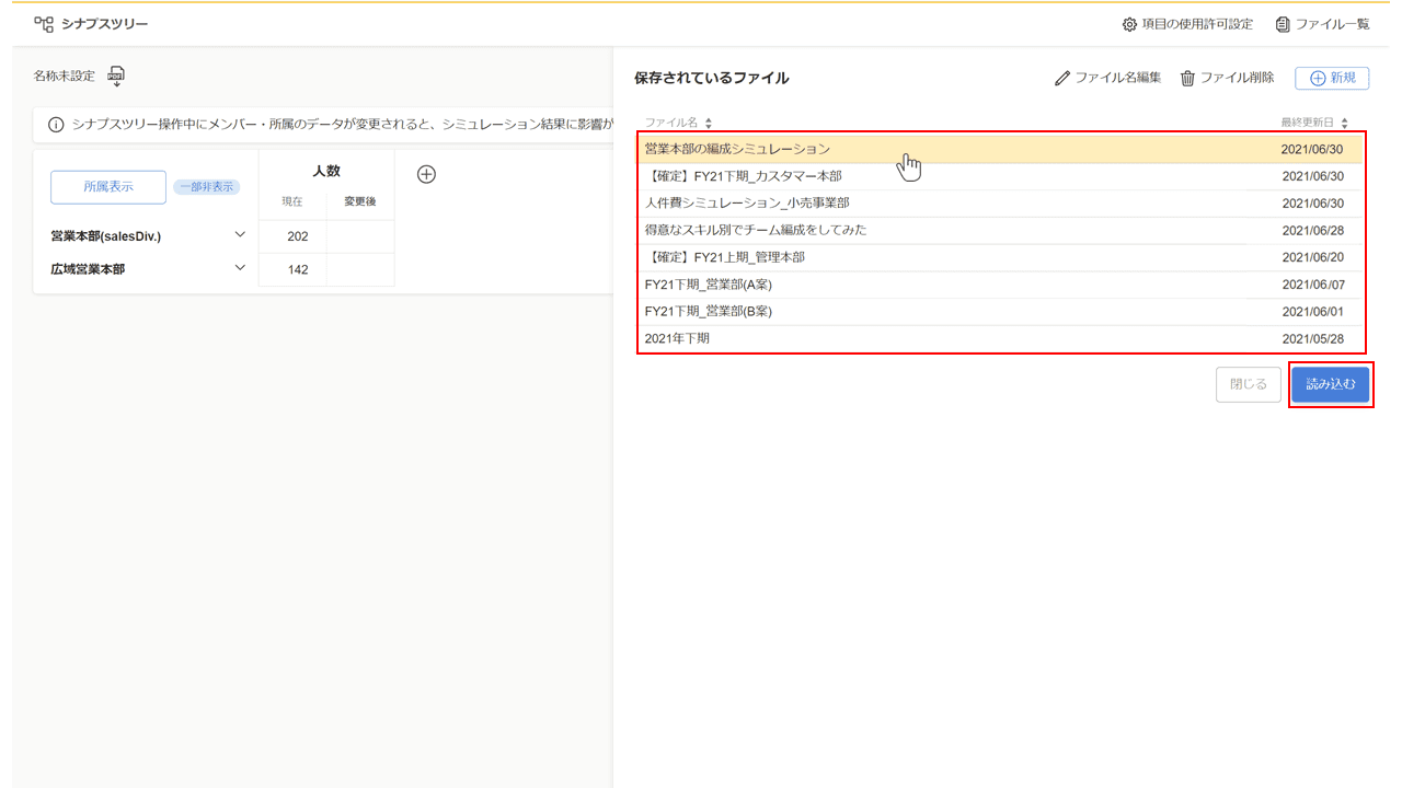 ファイル名の一覧から表示したいファイル名を選択し、『読み込む』をクリックします。