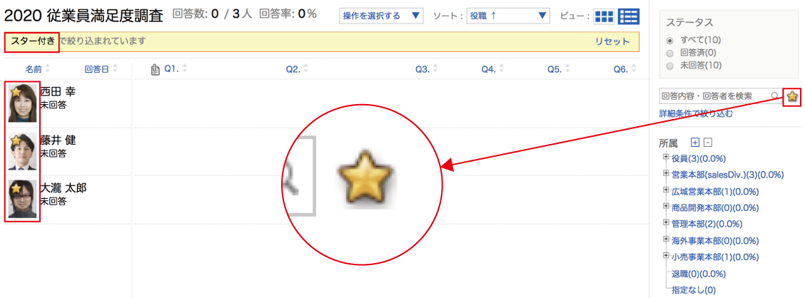 例えば途中から回答者に追加した複数人に案内を送りたい場合、顔写真左上に『スター』をつけ絞り込むことで任意の回答者に案内が送付できます。