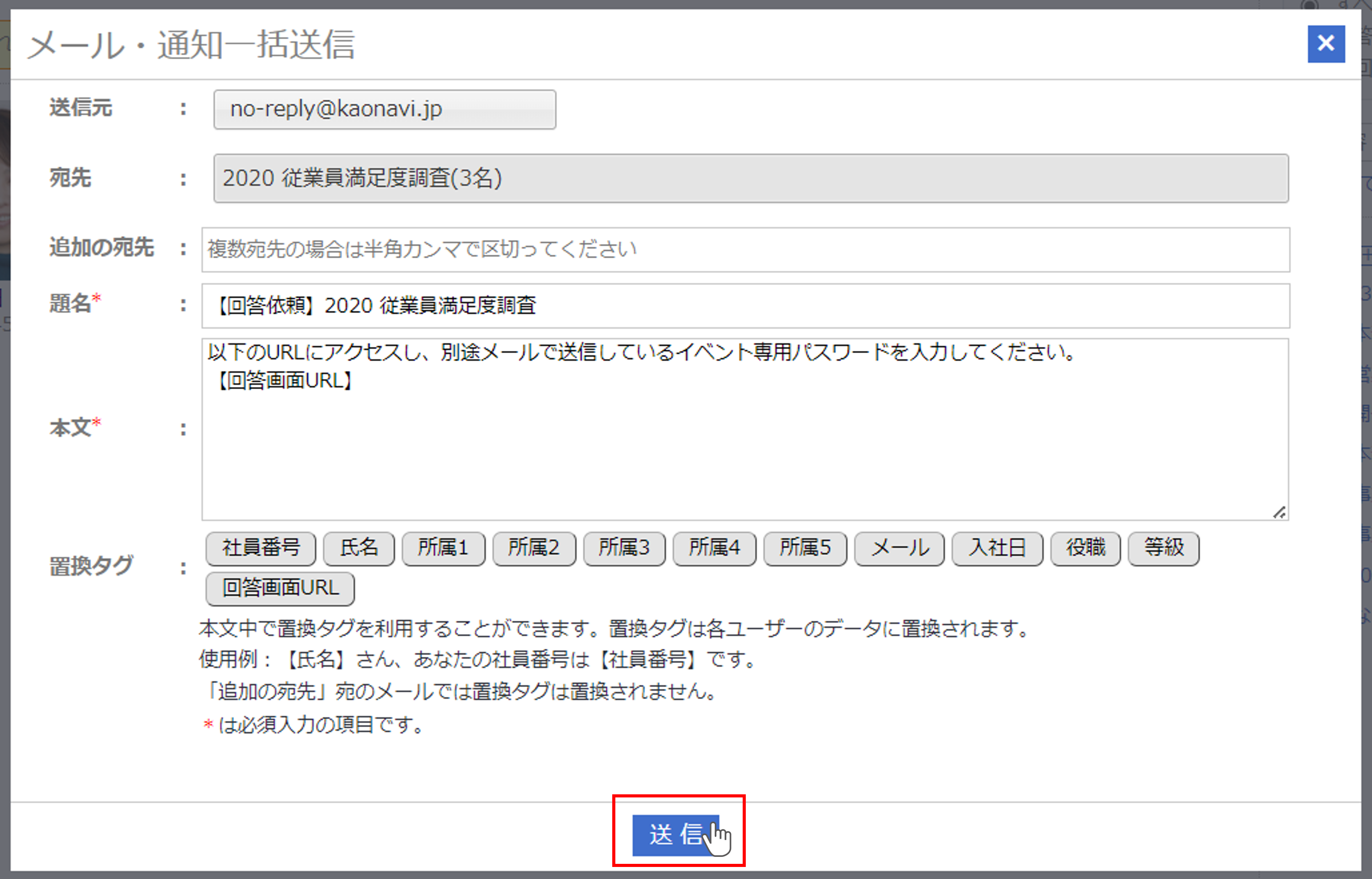 | 追加の宛先 | 『宛先』以外に通知を送りたい人のメールアドレス ※追加の宛先に入れた人には置換タグ部分は置換されずに送られるためアンケートに回答することはできません |