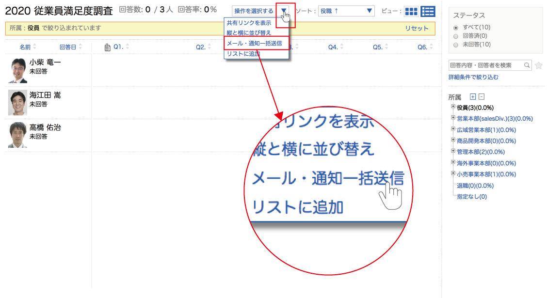 案内を送付する回答者が絞り込めたら、画面上部の『操作を選択する▼』プルダウンから『メール・通知一括送信』を選択します。