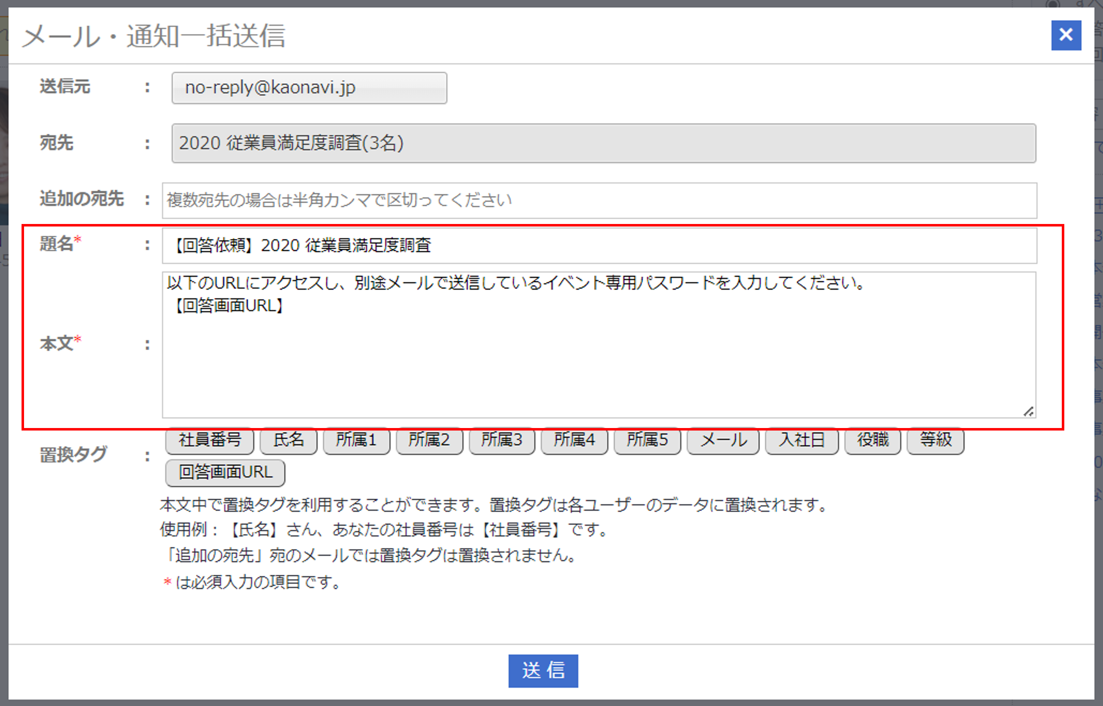 | 追加の宛先 | 『宛先』以外に通知を送りたい人のメールアドレス ※追加の宛先に入れた人には置換タグ部分は置換されずに送られるため アンケートに回答することはできません |