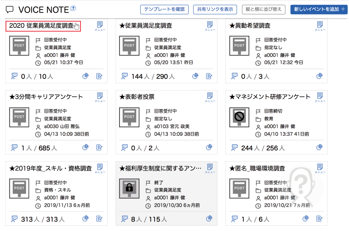 案内を送付したいイベント名をクリックし、回答者一覧画面を開きます。