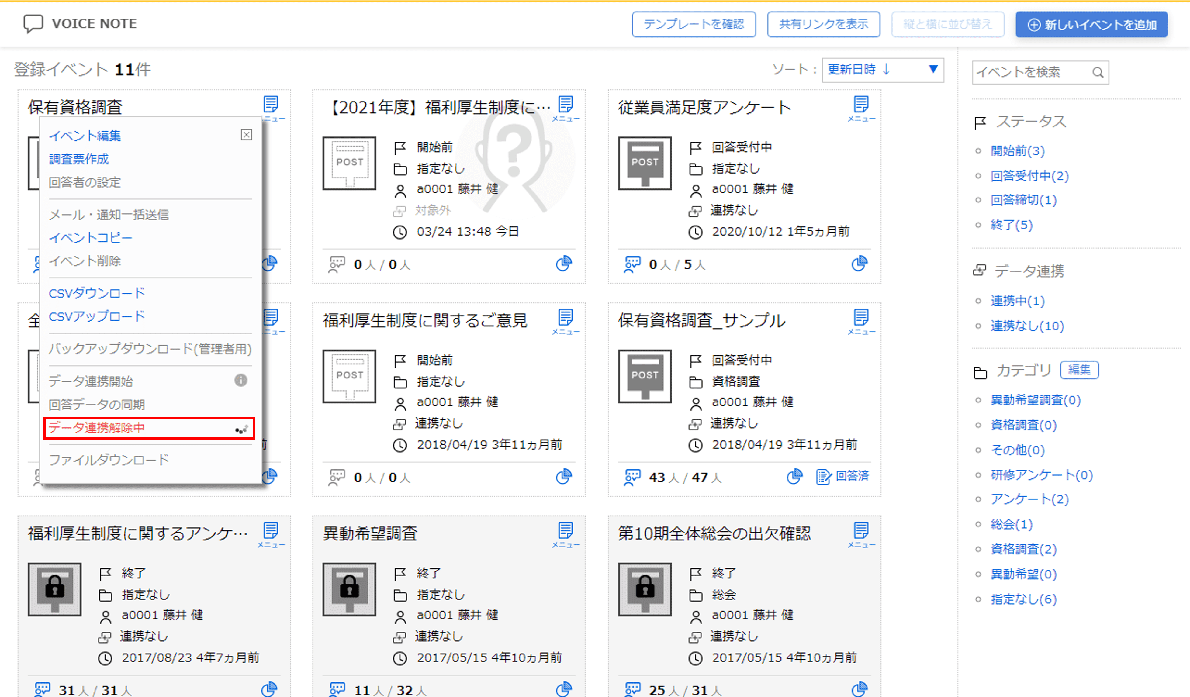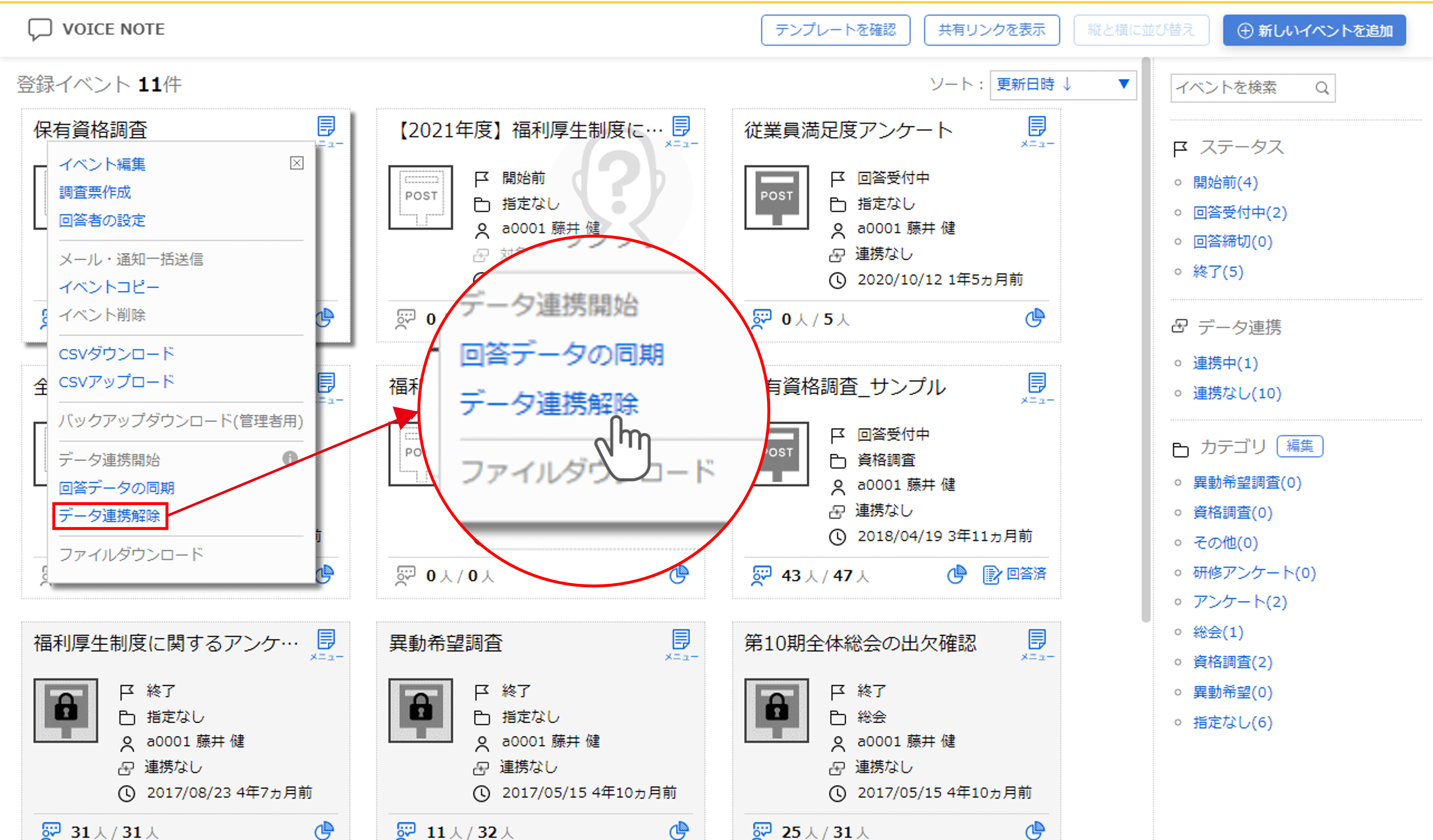 データ連携を解除するイベントのメニューから、『データ連携解除』をクリックします。