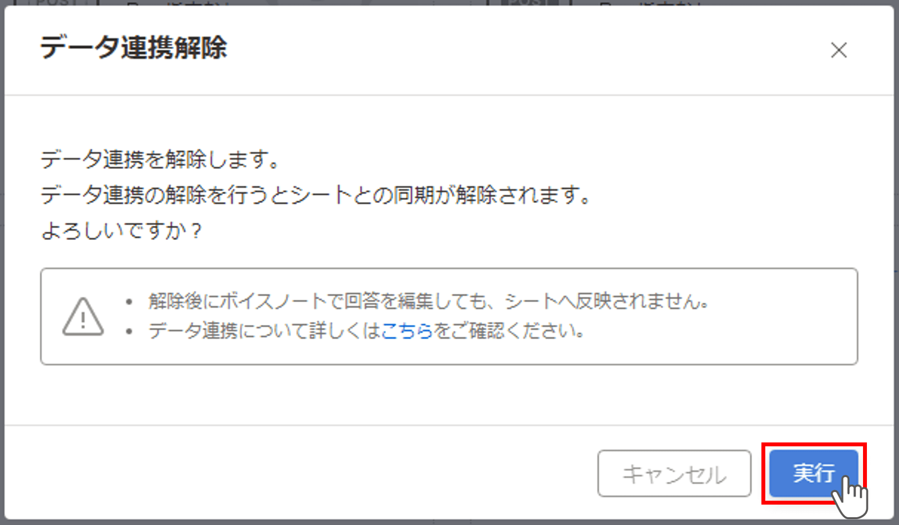 一度データ連携を開始後に解除すると、再度同じシートへの連携はできなくなります(再度イベントからデータ連携を行う場合は、別のシートが作成されます)。連携を解除して問題ないか、開始前に確認してください。