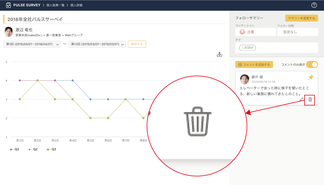 自身で書いたコメントにはごみ箱マークも表示されます。
