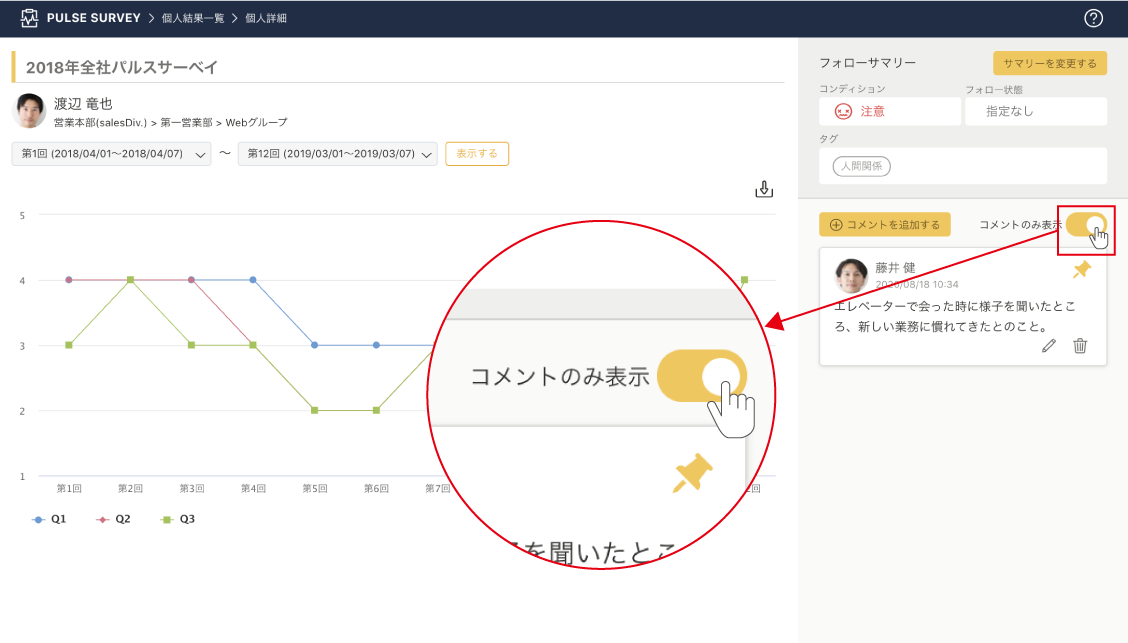 『コメントのみ表示』をONにすると、コメントのみが表示されます。