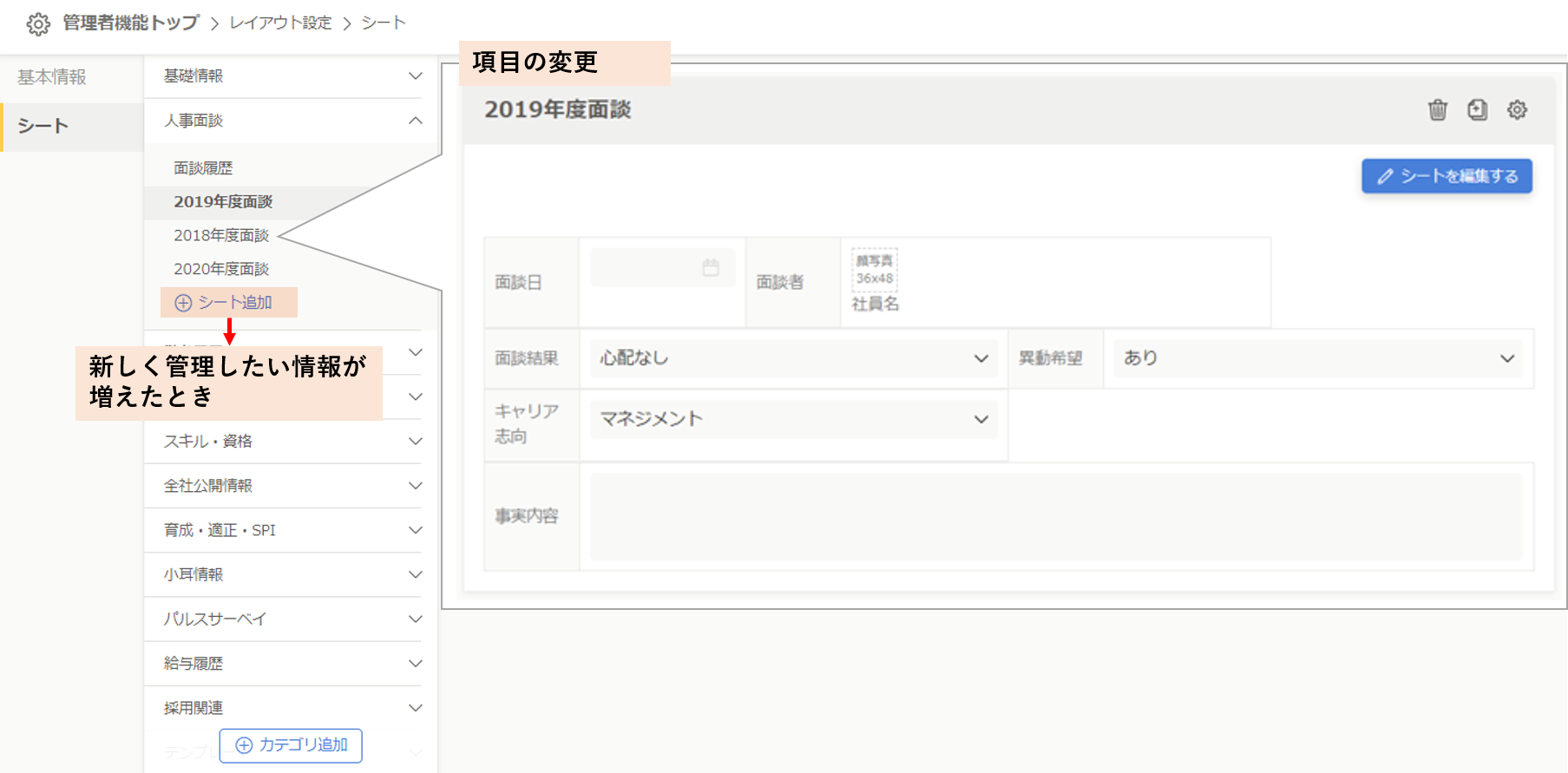 | シート情報 | 基本情報以外の従業員情報。評価履歴や保有資格、身上情報などさまざま |