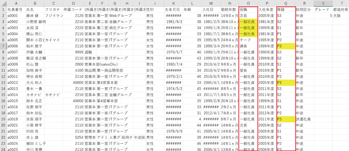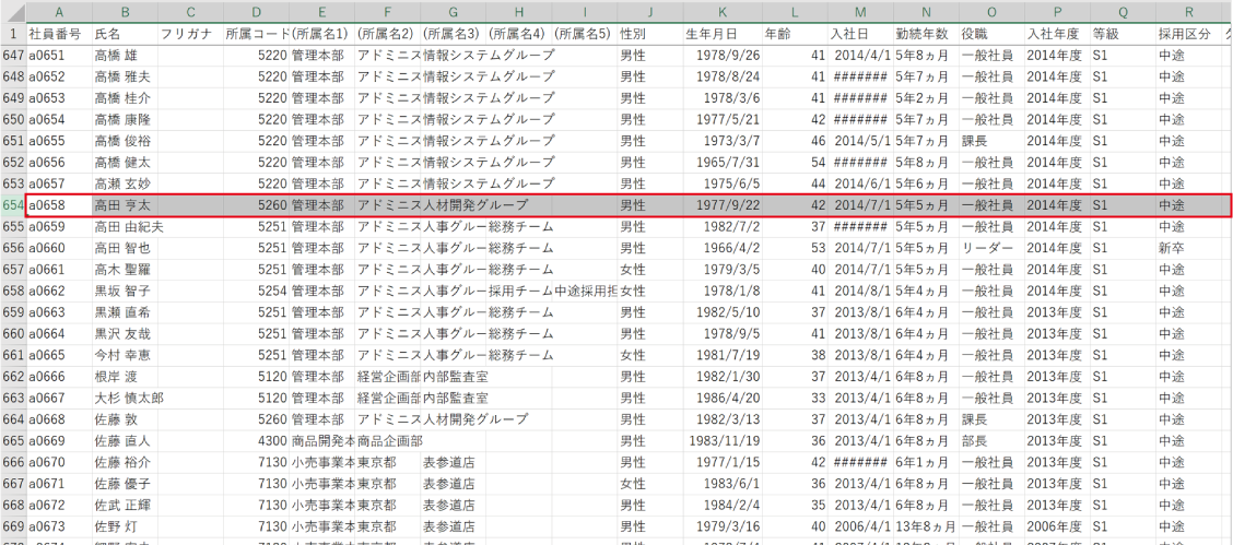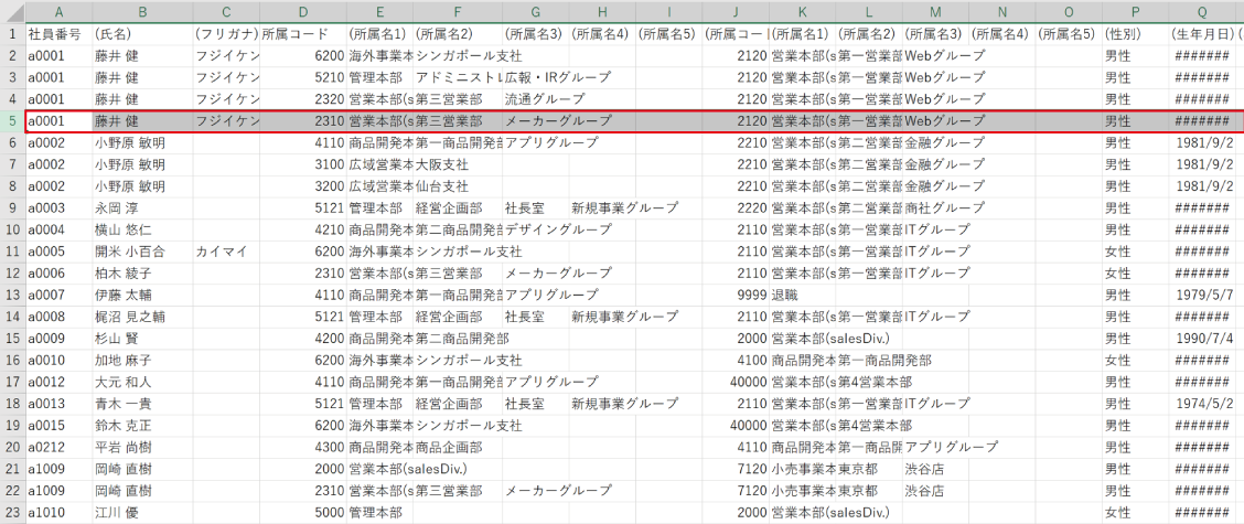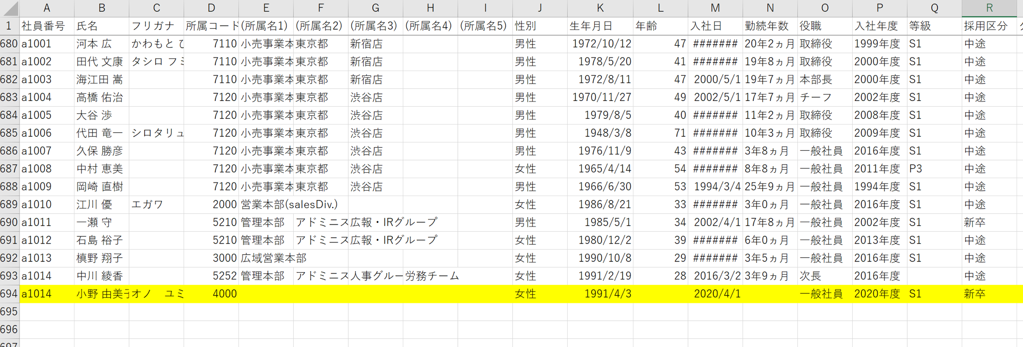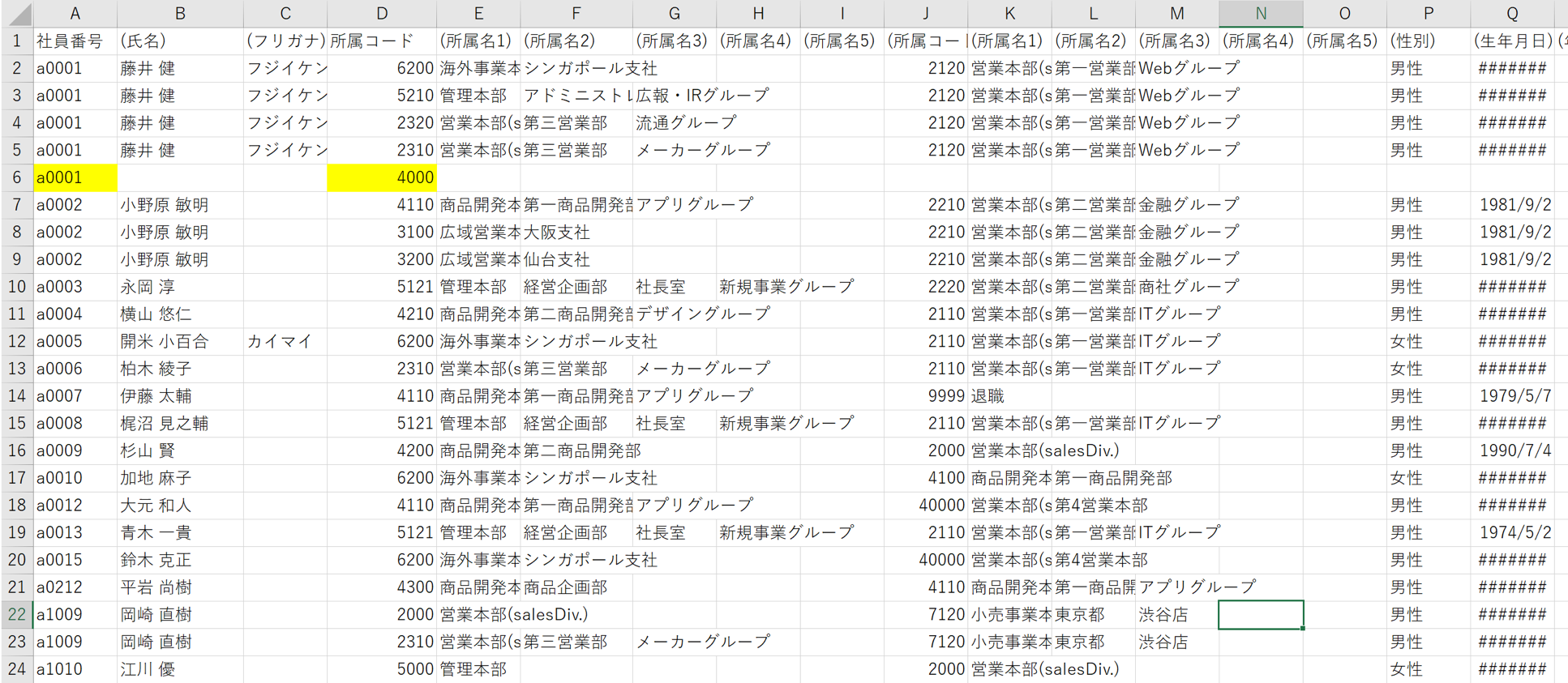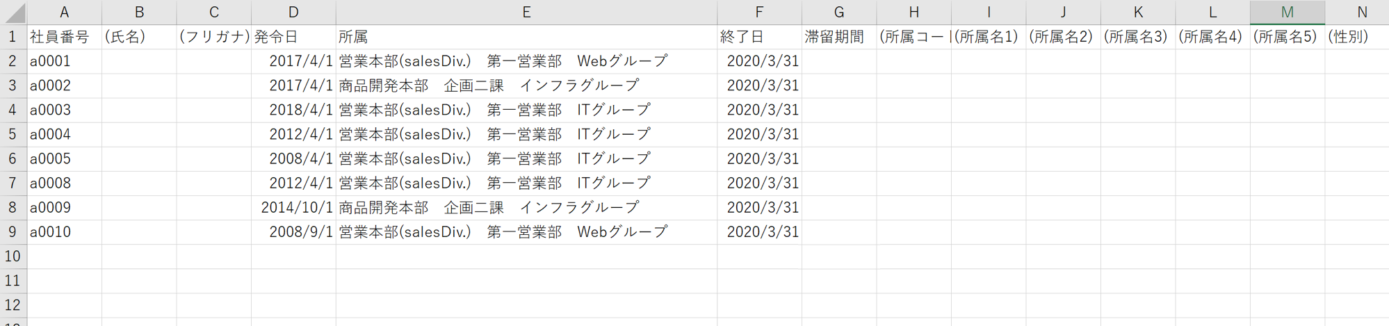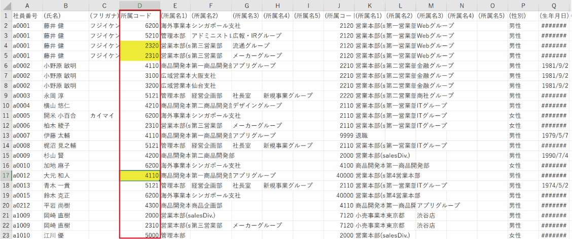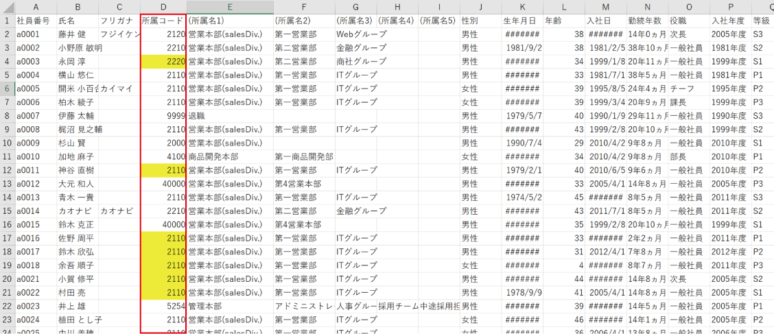 従業員の所属が変わる場合、該当メンバーの『所属コード』列を書き換えます。