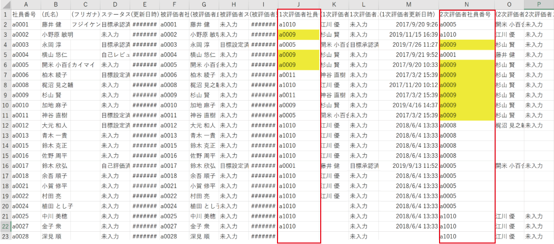 変更が必要な被評価者(対象者)について、参加者列の社員番号を異動先の参加者の社員番号に変更しアップロードします。