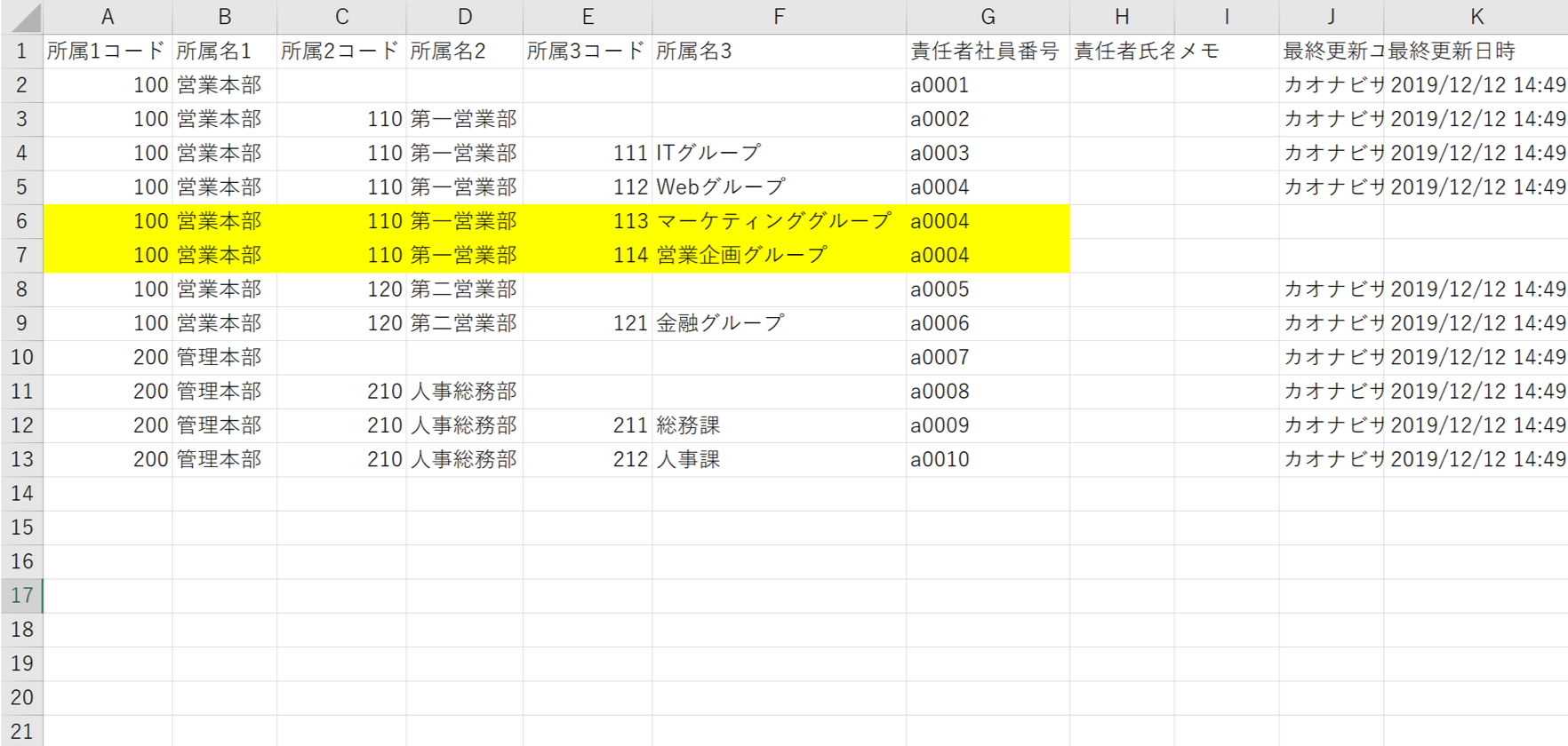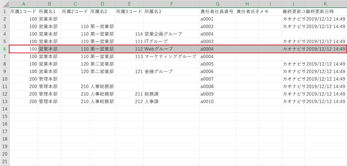 部門の責任者が変更になる場合、『責任者社員番号』列の社員番号を変更します