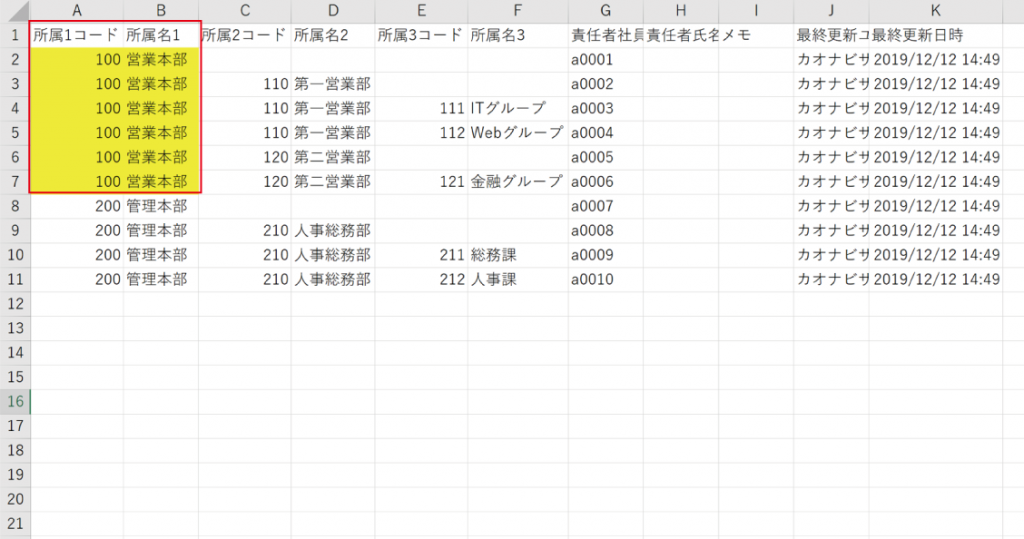 上位の階層にある(親の)組織(以下の例では『営業本部』『第一営業部』)は他の行からコピーします。