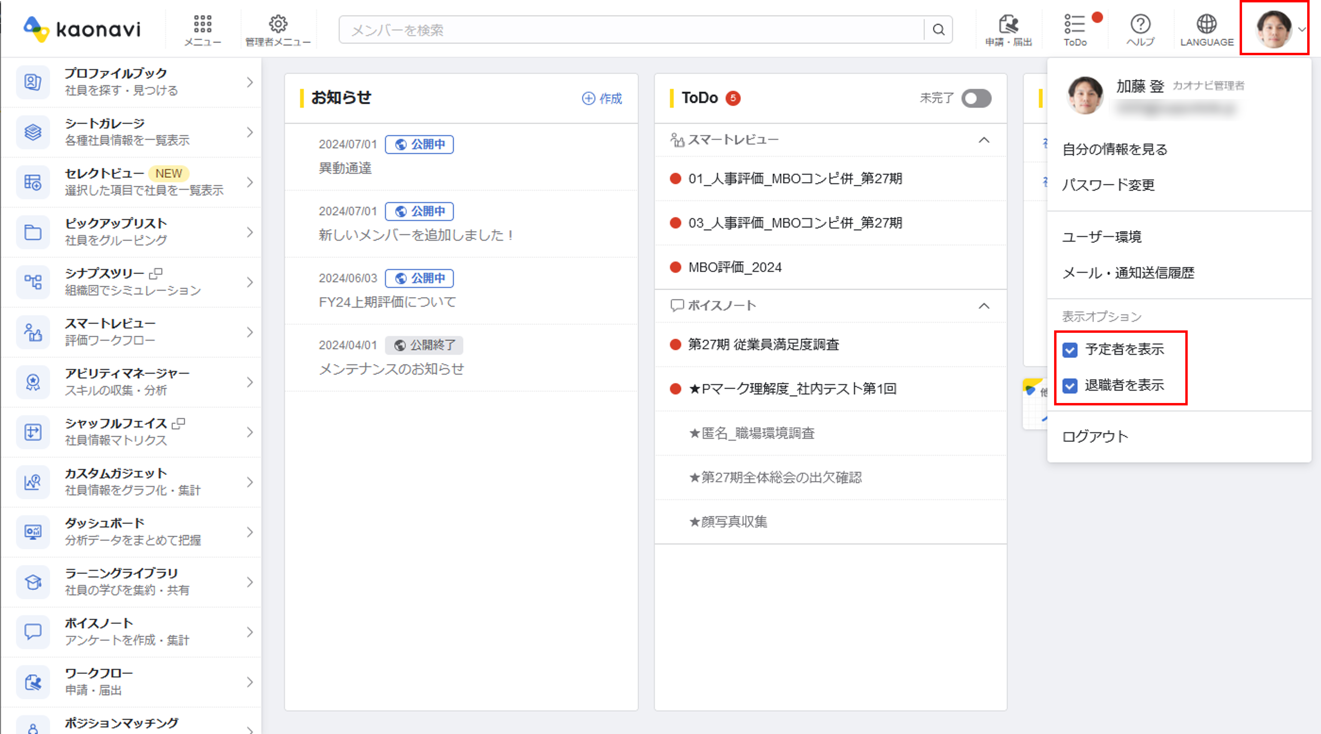 グローバルヘッダーのユーザーアカウントメニューにおいて、「予定者を表示」「退職者の表示」のチェックをそれぞれ外すことで、カオナビの機能上で予定者・退職者を非表示にし、現職者のみを表示対象とすることが可能です。