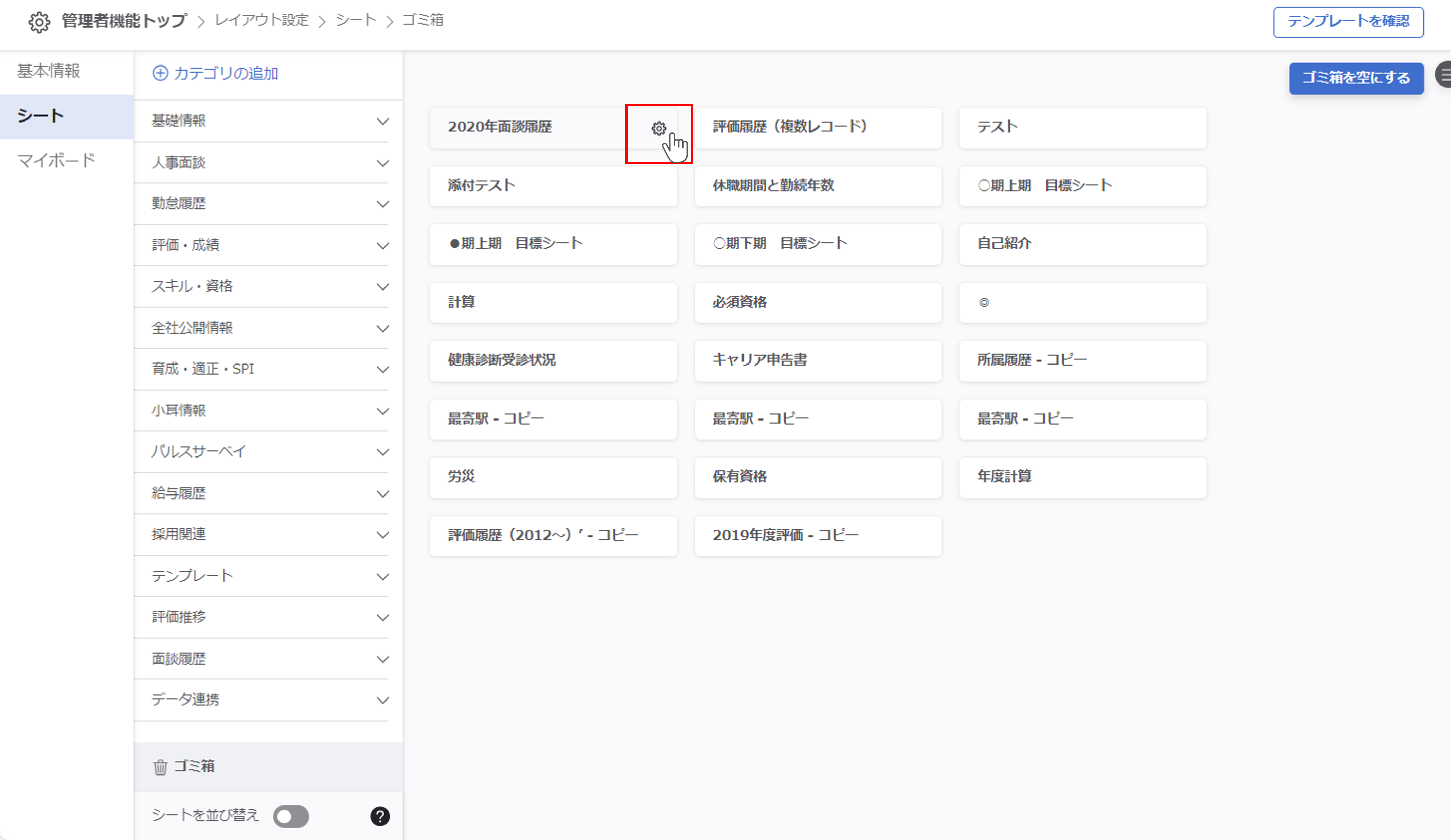ゴミ箱内のシートを復元する場合は画面左下の『ゴミ箱』をクリックします。