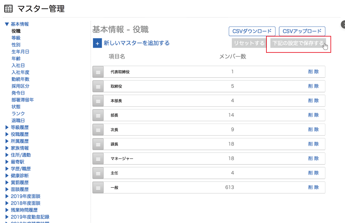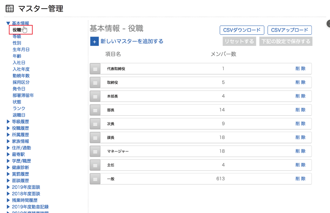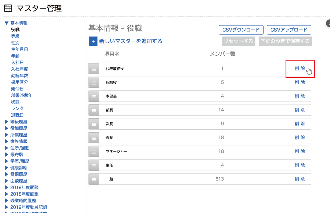 削除したいマスターの右側にある『削除』をクリックします。