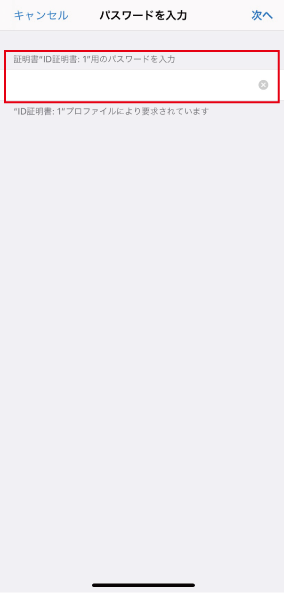 証明書のパスワードを入力します。メールに記載された証明書のパスワードを入力してください。