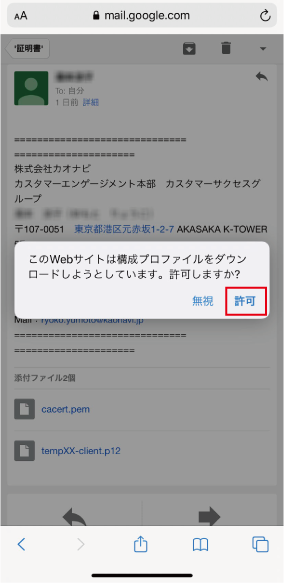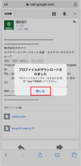 受信したメールを開き、クライアント証明書([顧客コード].p12)をタップします。