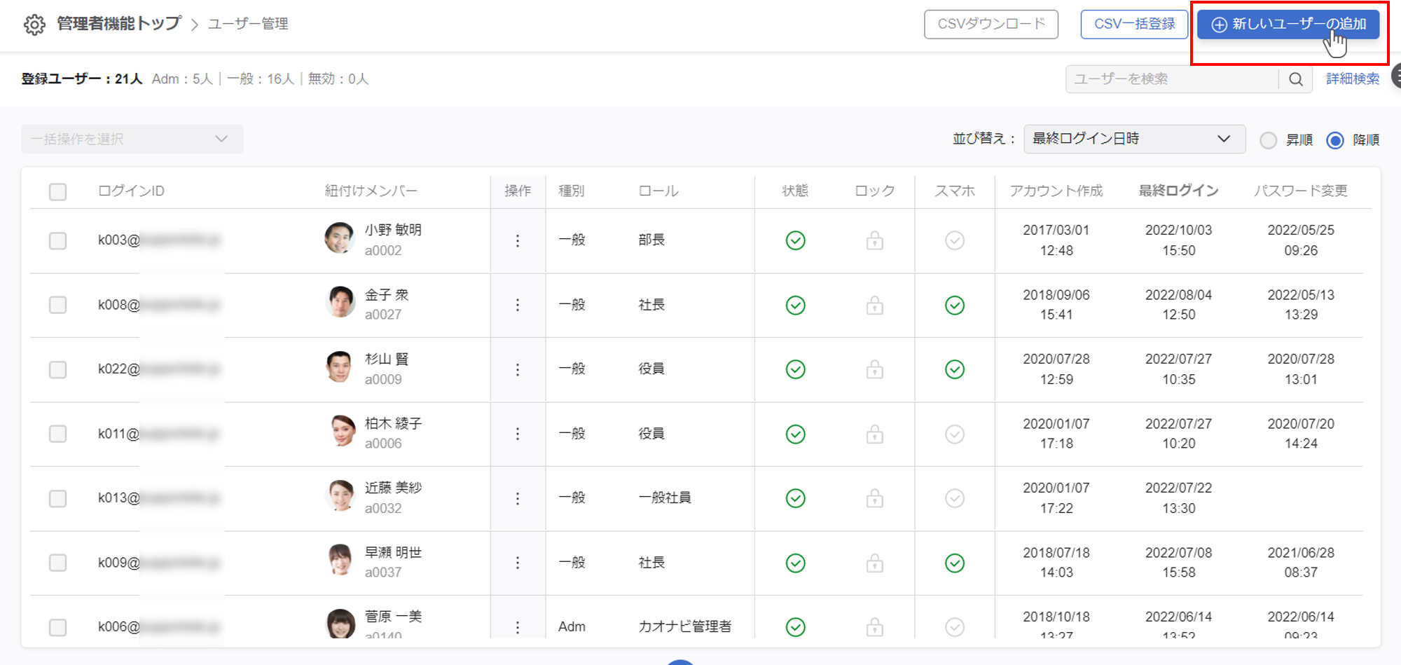 カオナビ管理者など、すでに存在している管理者(Adm)ユーザーがアクセスログを確認するのであればこの操作は必須ではありません。アクセス管理で『アクセスログ出力』が『利用可(○)』となっているかだけ確認して下さい。