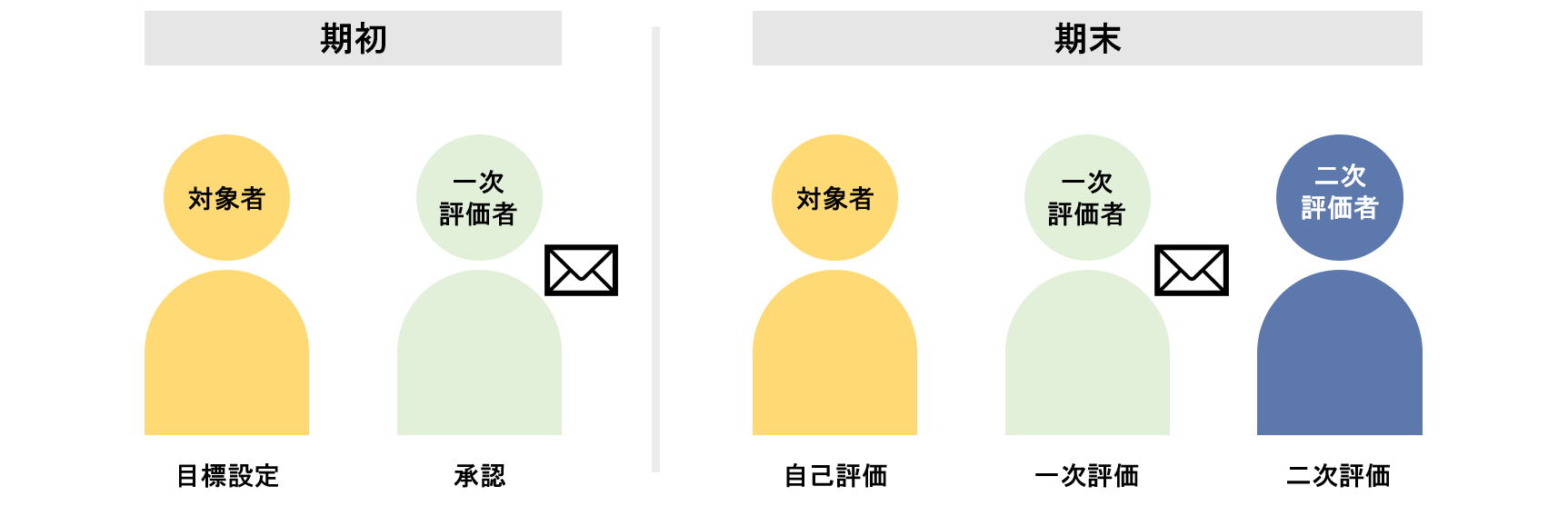 以下のようなワークフローの時、一次評価者は期初でも期末でも、リマインドメールを送付することができます。