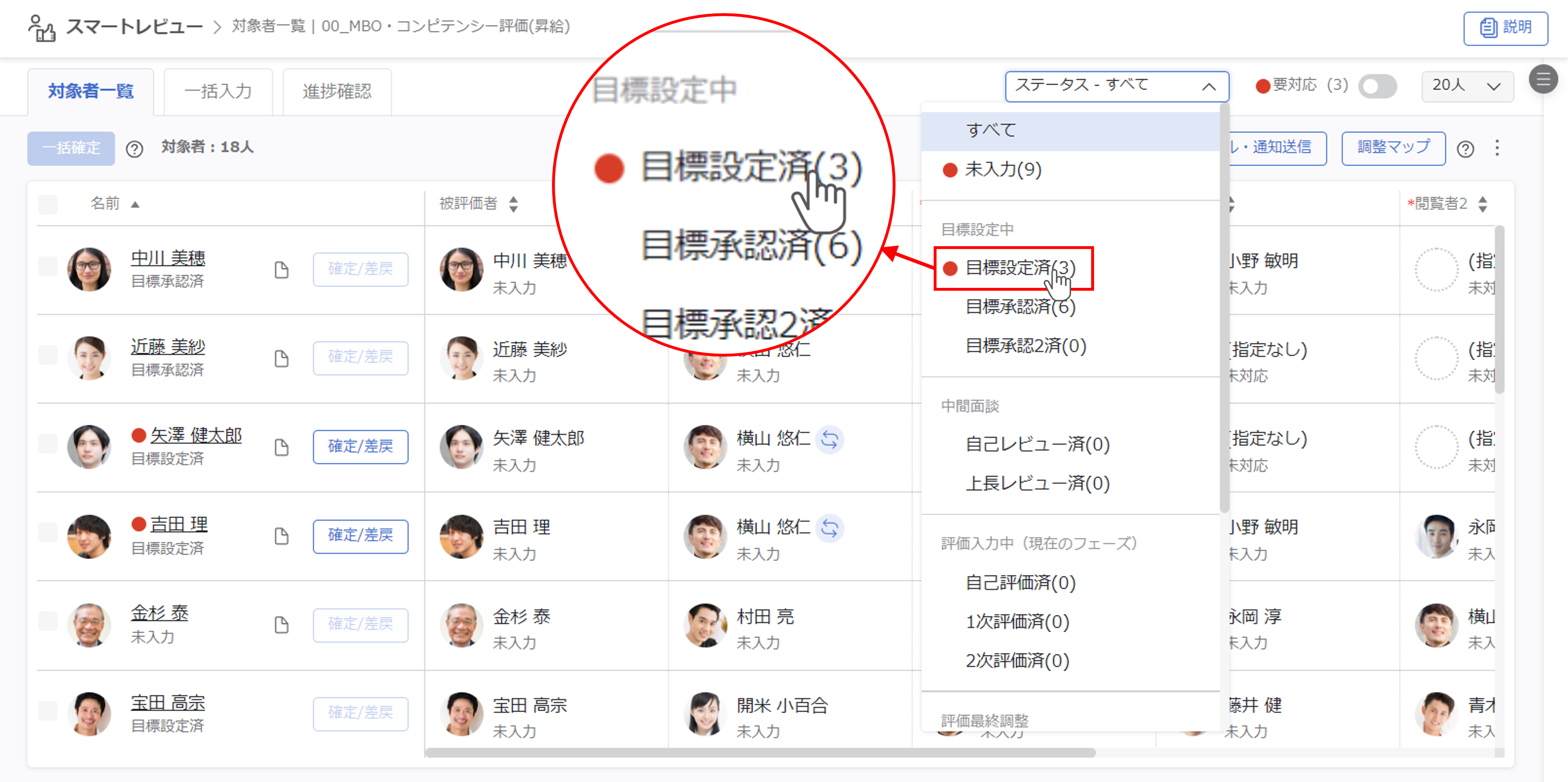 「対象者一覧画面」右上のステータスプルダウンより、要対応の対象者がいるステータス(赤丸が付いています)を選択することで、該当の対象者にチェックが入るようになり、「一括確定」ボタンがクリックできる状態となります。