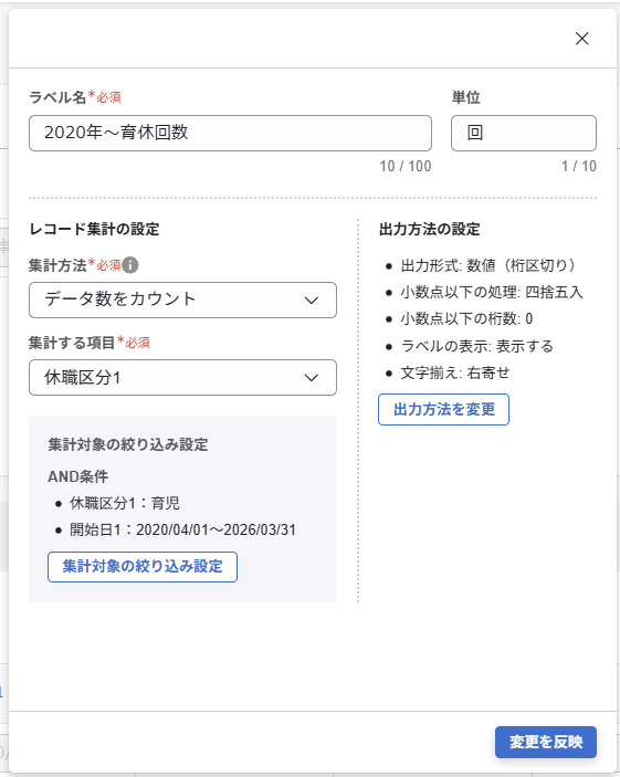これにより、「20XX年度で1ヶ月の残業時間が45時間を超えた月の数を数える」や、「特定の期間で育児休暇を取得した回数を数える」などの使い道で集計対象を絞り込めます。