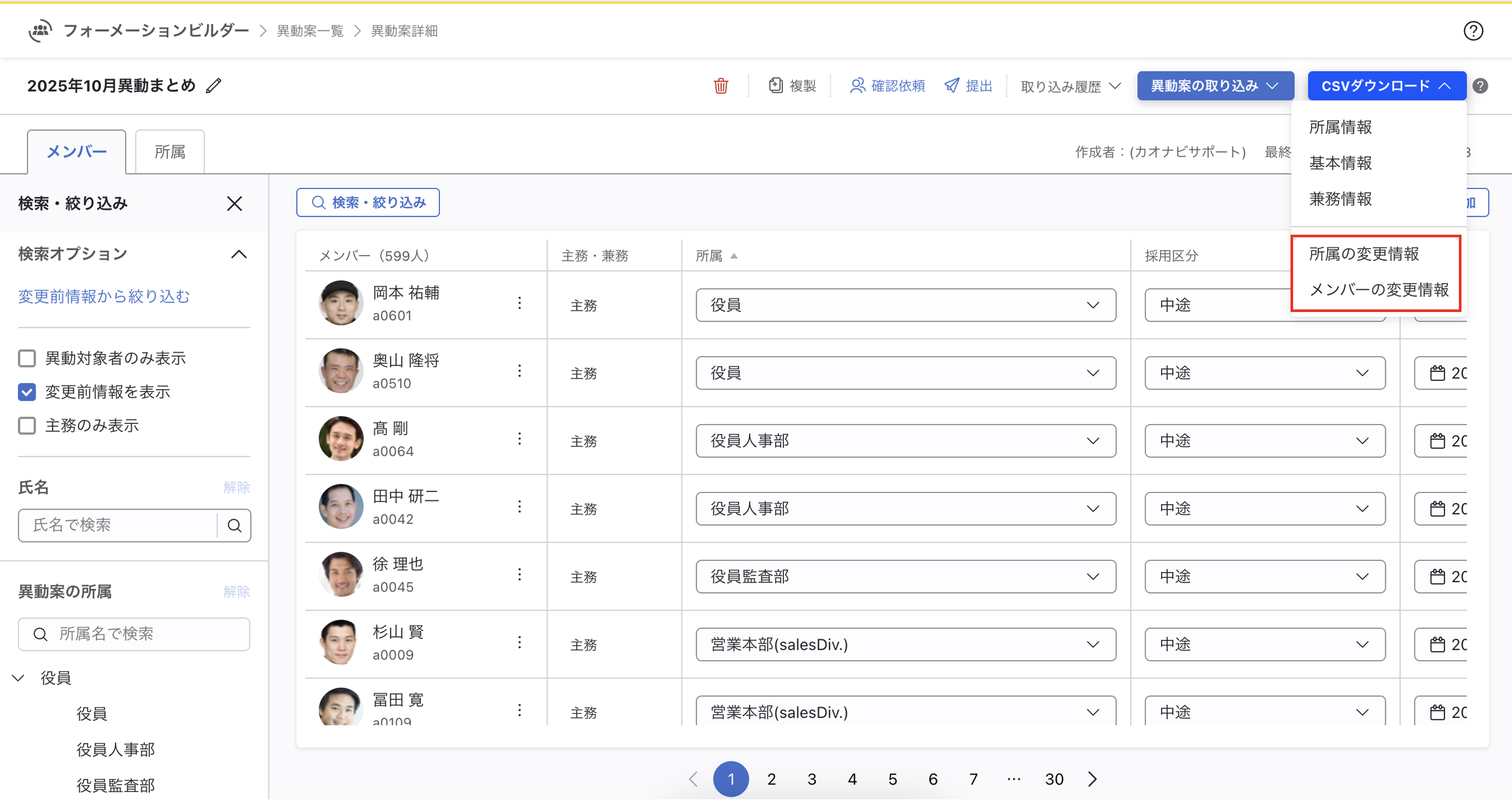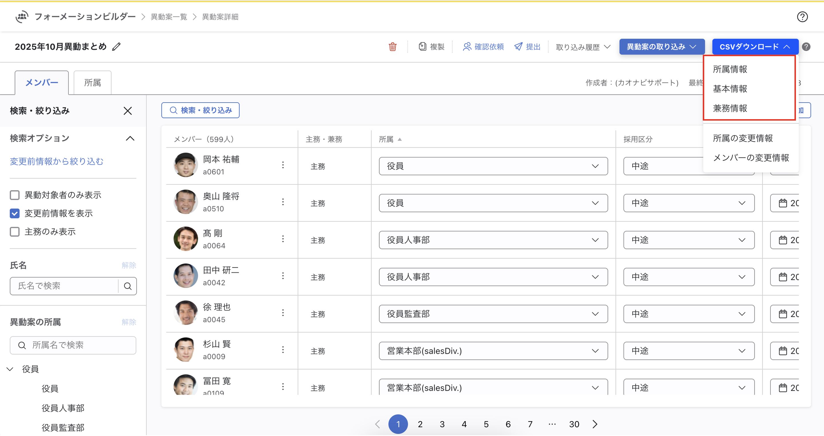 異動案上のデータをCSV出力する