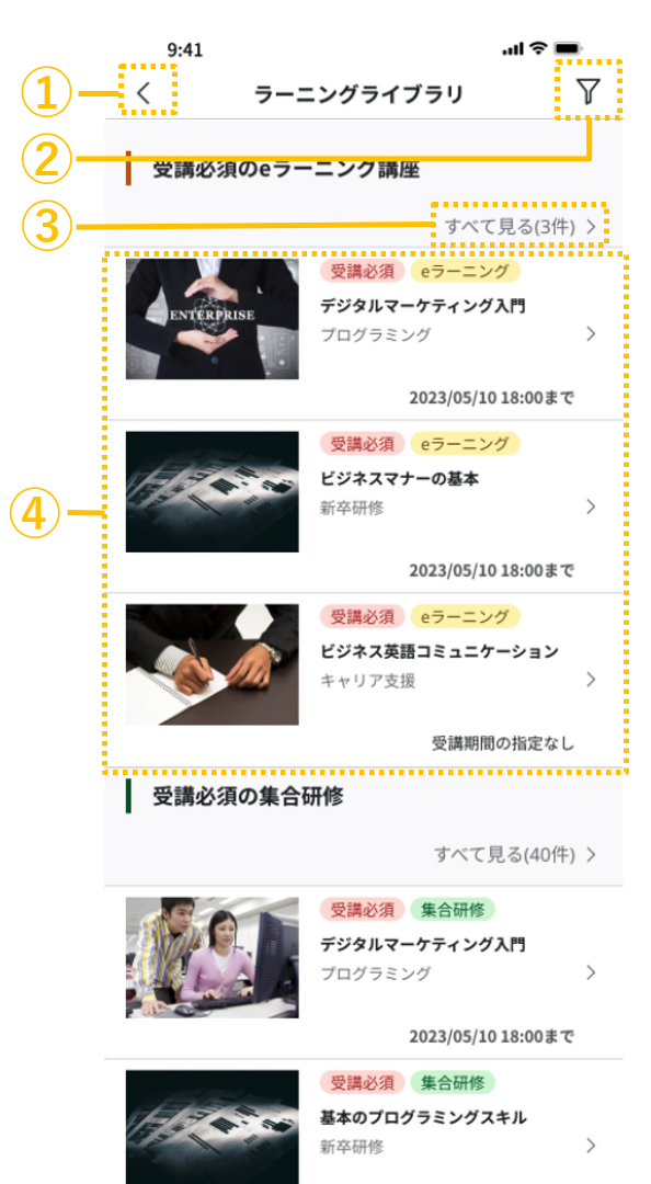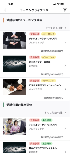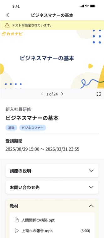 ※アプリではラーニングライブラリの『プリセット講座』は非対応となります。プリセット講座を公開している場合講座一覧に表示されますが、講座を受講することはできません。