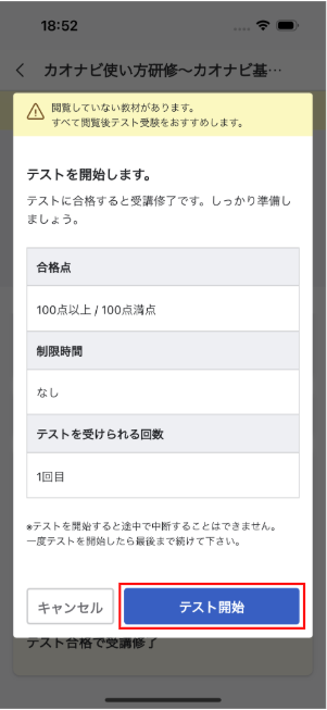 教材コンテンツの閲覧、視聴が完了したらテストを受けます。