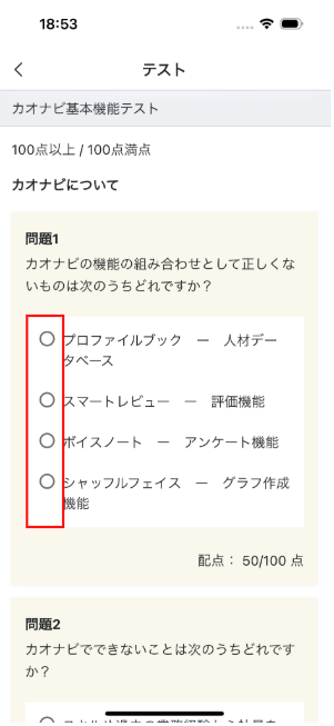 テスト画面が開かれるので、選択肢にチェックを入れます。