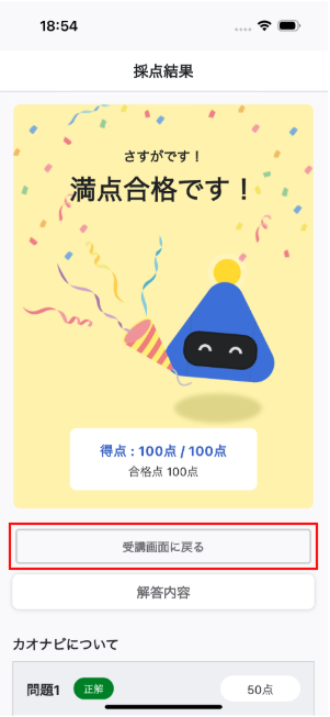 採点され合格/不合格が表示されるので、解説などを読み振り返りを行ってください。