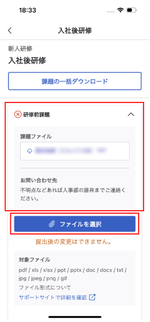 課題タイトルや注意事項・課題ファイル・提出期限・お問合せ先などは『研修課題の設定>③事前課題を追加する』にて設定した内容が表示されます。